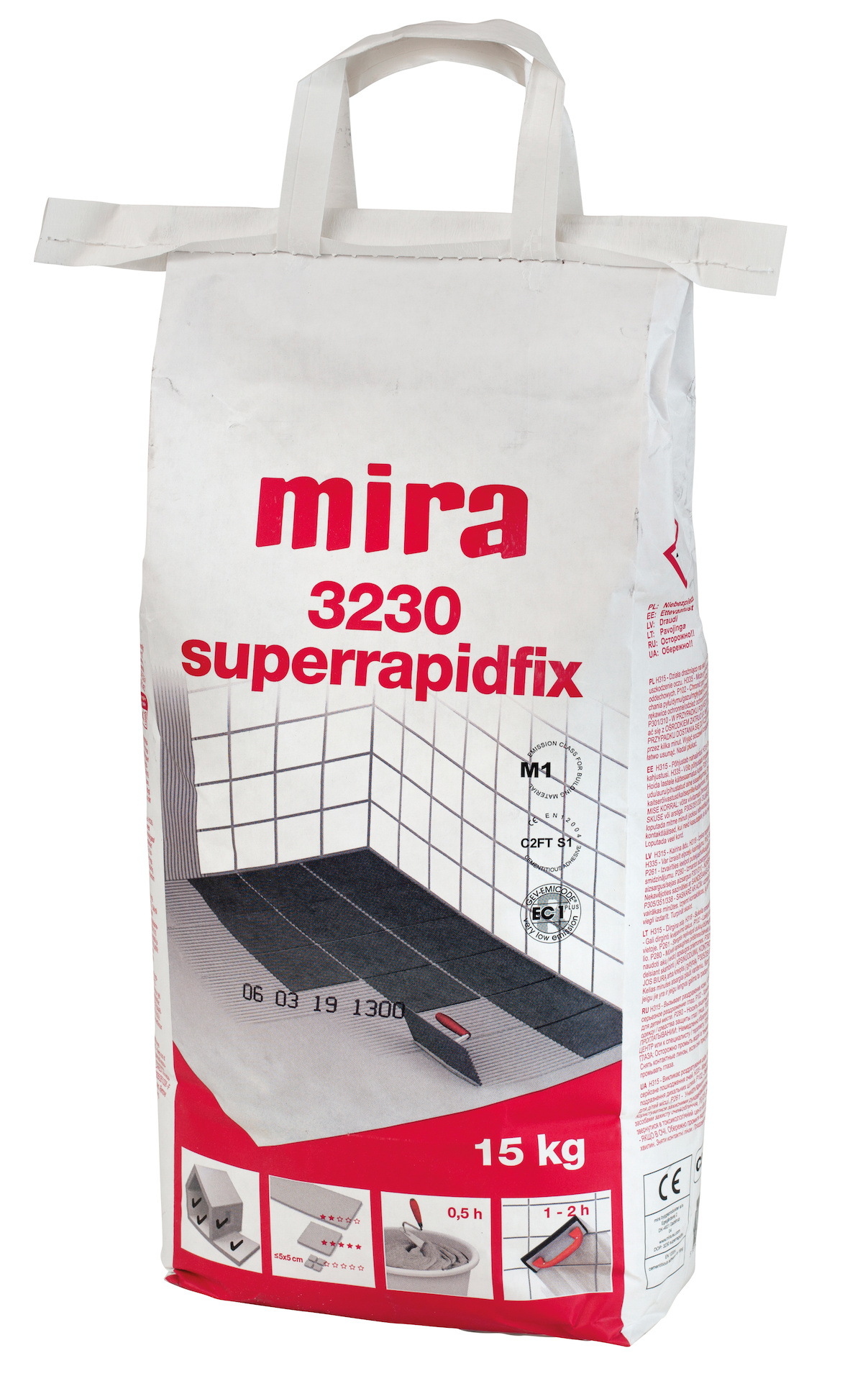 Mira 3230 superrapidfix er basert på hvit lavalkalisk sement, som er enkel å bearbeide og fordele på overflaten. Det er et bredt anvennelig lim som opfyller kravene til en lang rekke oppgaver uansett underlag og flistype. 3230 superrapidfix anbefales spesielt der det stilles krav til kort herdetid. Limet er spesielt velegnet til varmegulv og til tynne, gjennomskinnelige fliser, glassmosaikk, lys marmor o.l.