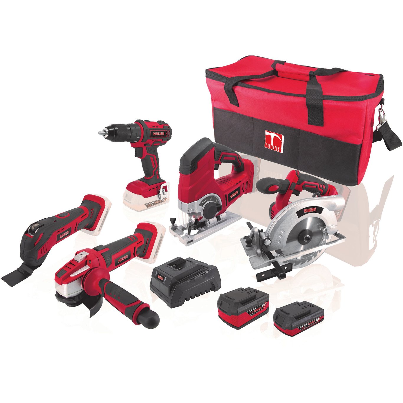 En god oppstartspakke med drill, vinkelsliper, multiverktøy, sirkelsag og stikksag. Inkludert er også 1stk batteri 18V/2Ah, 1 stk batteri 18V/4Ah og lader.