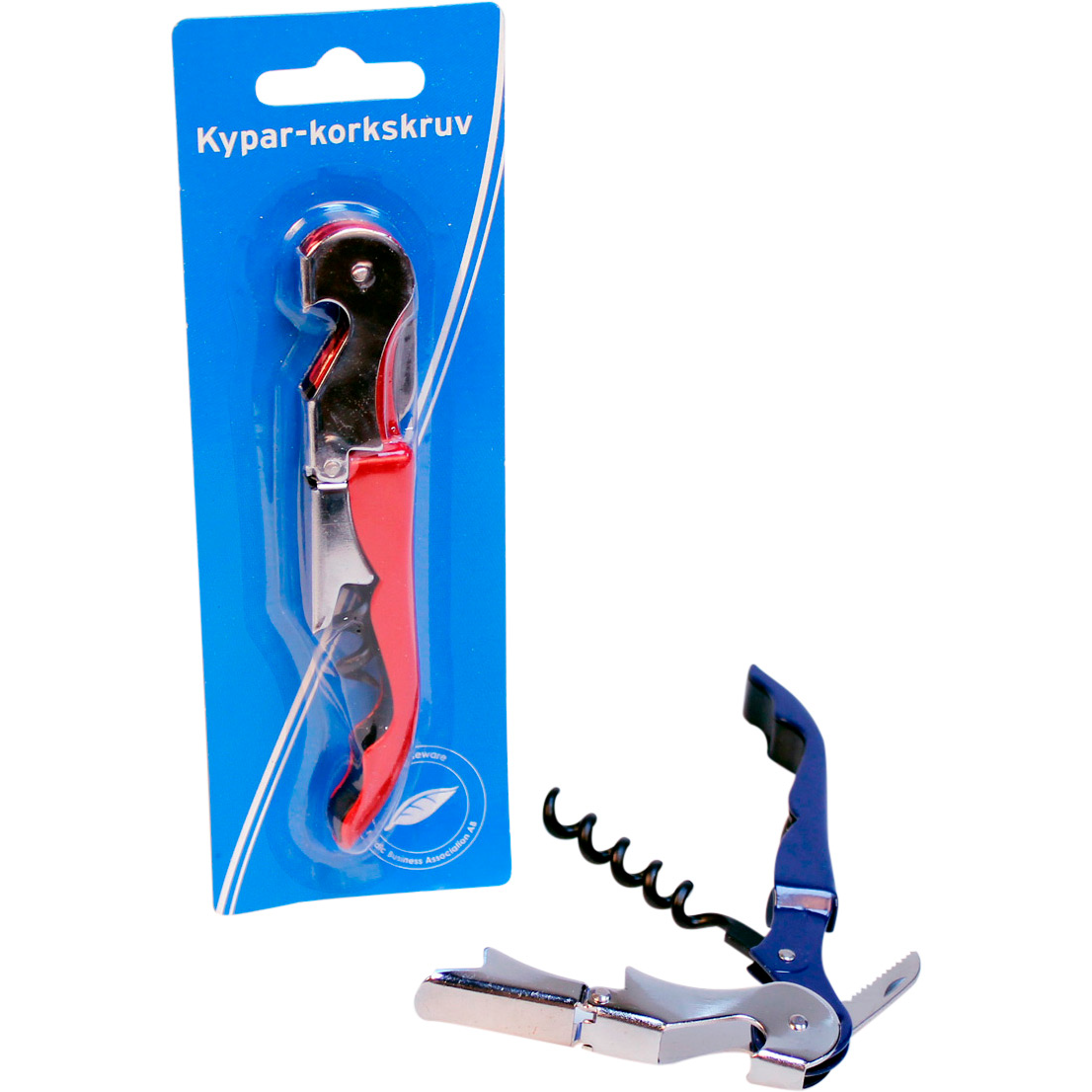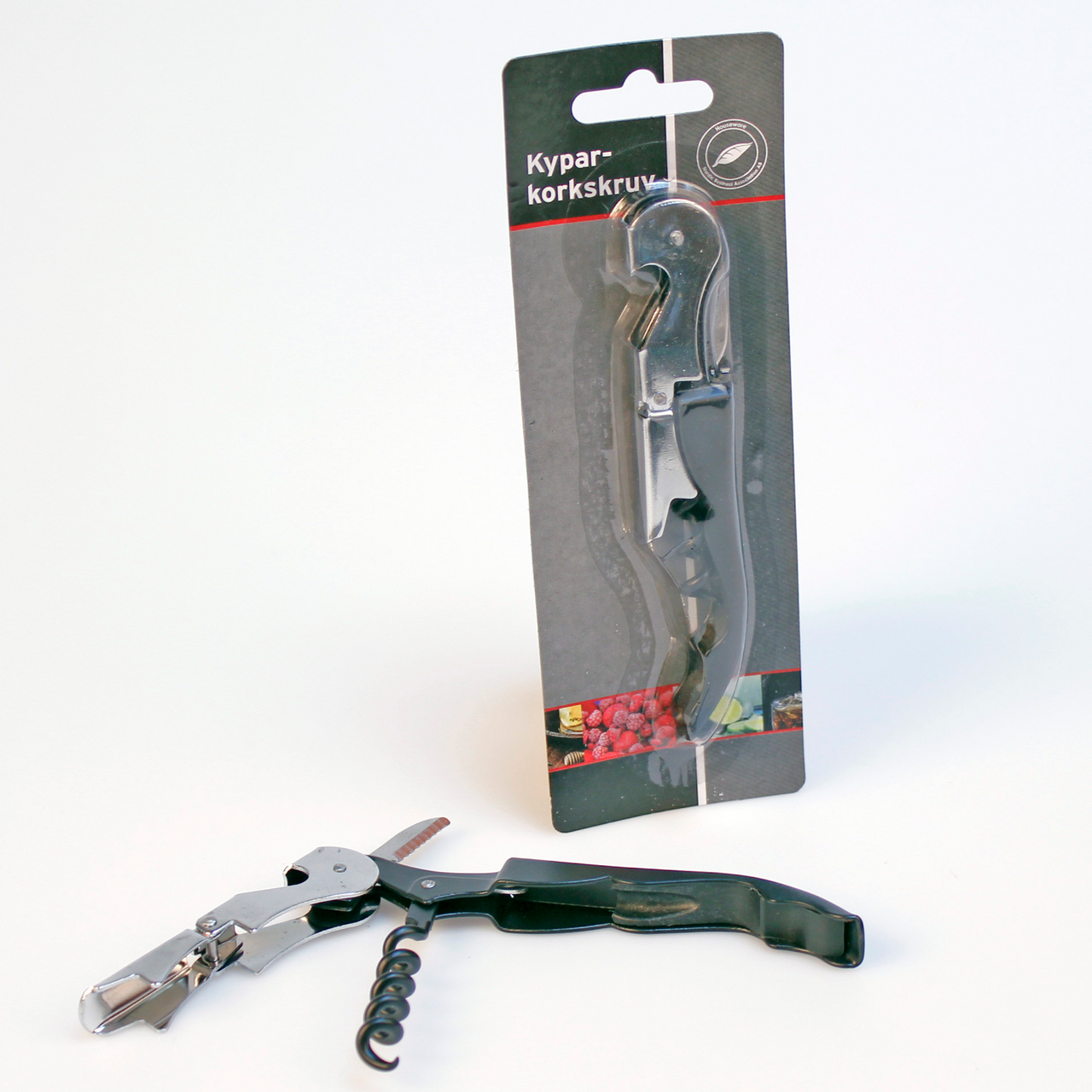 Vinåpner med korketrekker, flaskeåpner og en liten kniv til å skjære folie av flaskens hals.