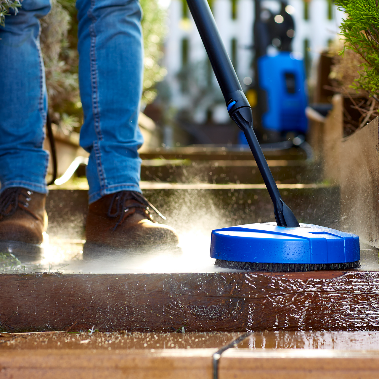 Denne terrassevaskeren fra Nilfisk er perfekt for mindre terrasser og oppkjørsler, og gjør rengjøringen rask og enkel. Den har børsteskjørt og sprutedeksel som forhindrer smuss og vann fra å sprute til uønskede områder.