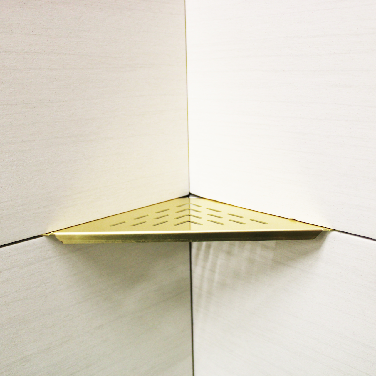 Denne praktiske hjørnehyllen kommer i polert messing, og vil gi et stilrent uttrykk i dusjen.