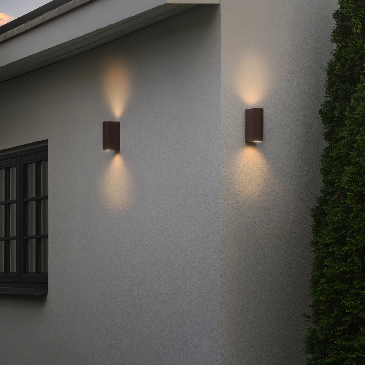 Dion Double er en moderne utendørs vegglampe som lyser både opp og ned og skaper en tydelig dekorativ effekt på fasaden.