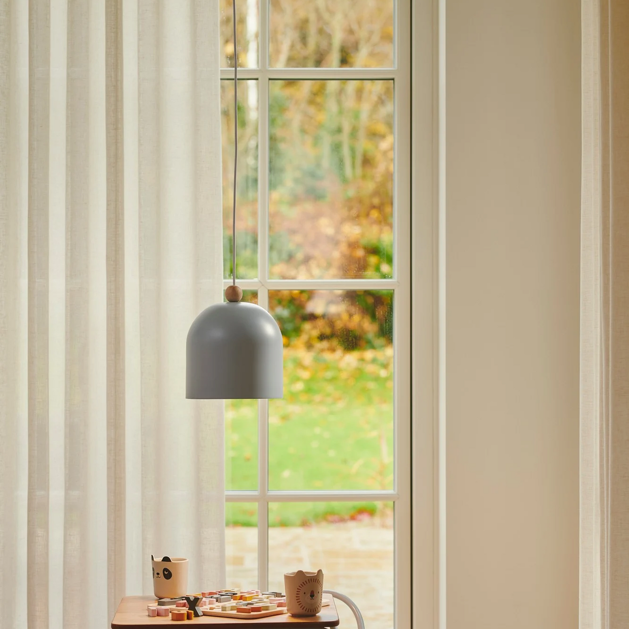 Taklampen passer godt over bord, i barnerom eller andre rom der du ønsker en enkel pendel med lun karakter. Den avrundede skjermen og den lille tredetaljen på toppen skaper et vennlig og lett uttrykk, samtidig som lampen gir et behagelig lys nedover.