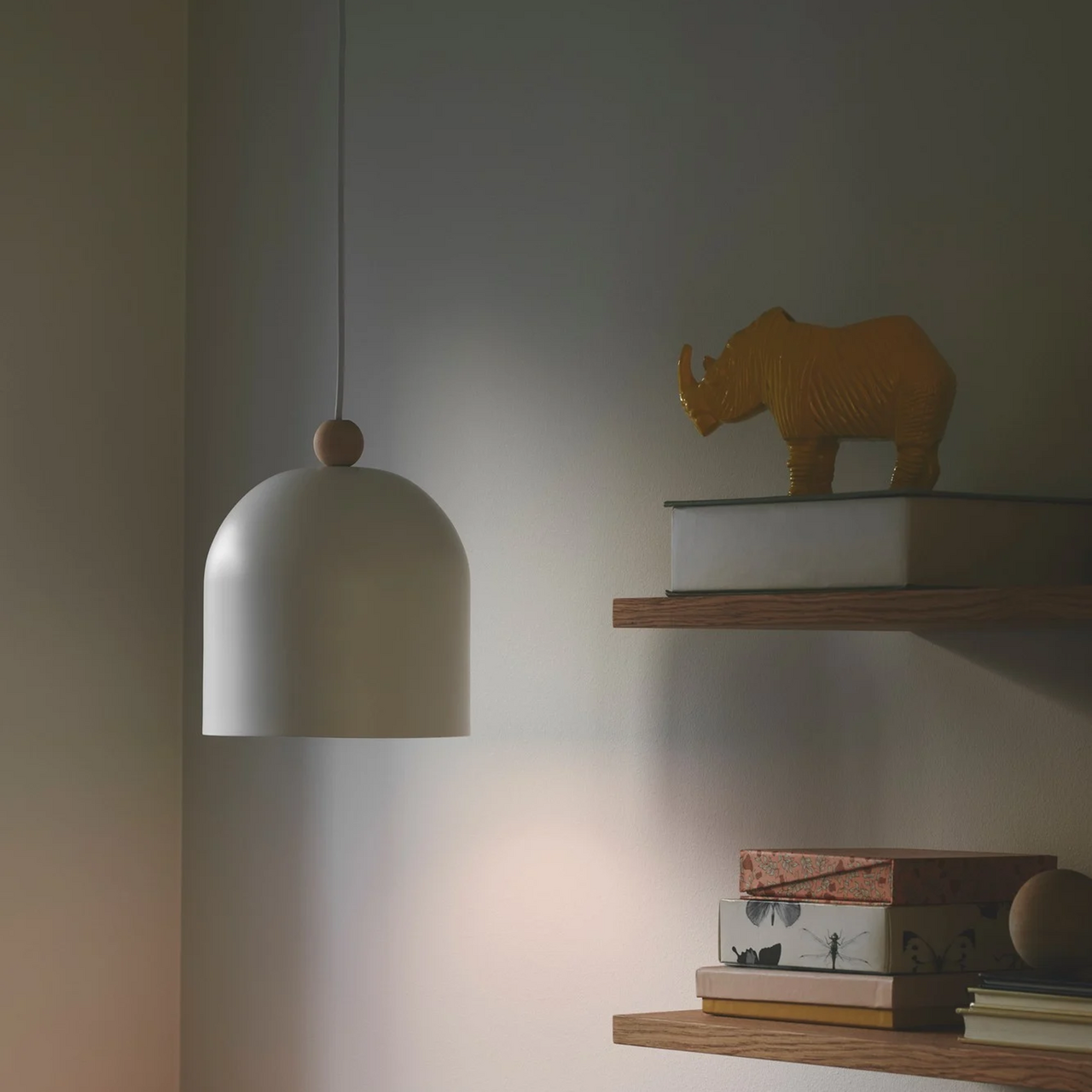Taklampen passer godt over bord, i barnerom eller andre rom der du ønsker en enkel pendel med lun karakter. Den avrundede skjermen og den lille tredetaljen på toppen skaper et vennlig og lett uttrykk, samtidig som lampen gir et behagelig lys nedover.