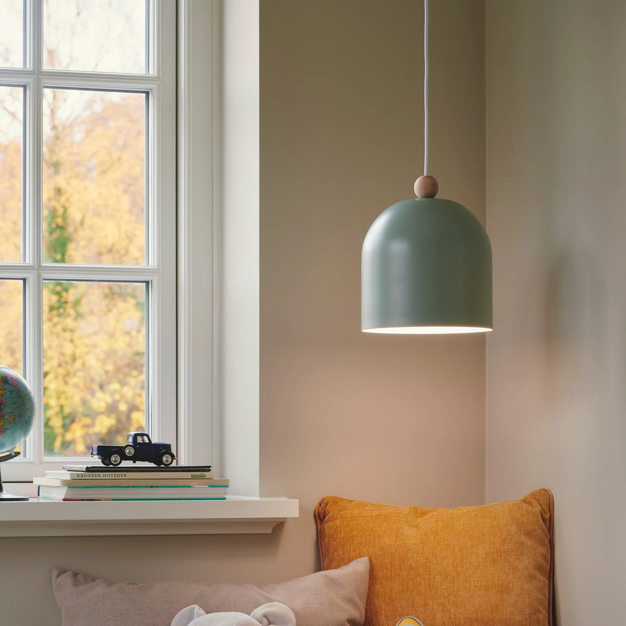 Taklampen passer godt over bord, i barnerom eller andre rom der du ønsker en enkel pendel med lun karakter. Den avrundede skjermen og den lille tredetaljen på toppen skaper et vennlig og lett uttrykk, samtidig som lampen gir et behagelig lys nedover.