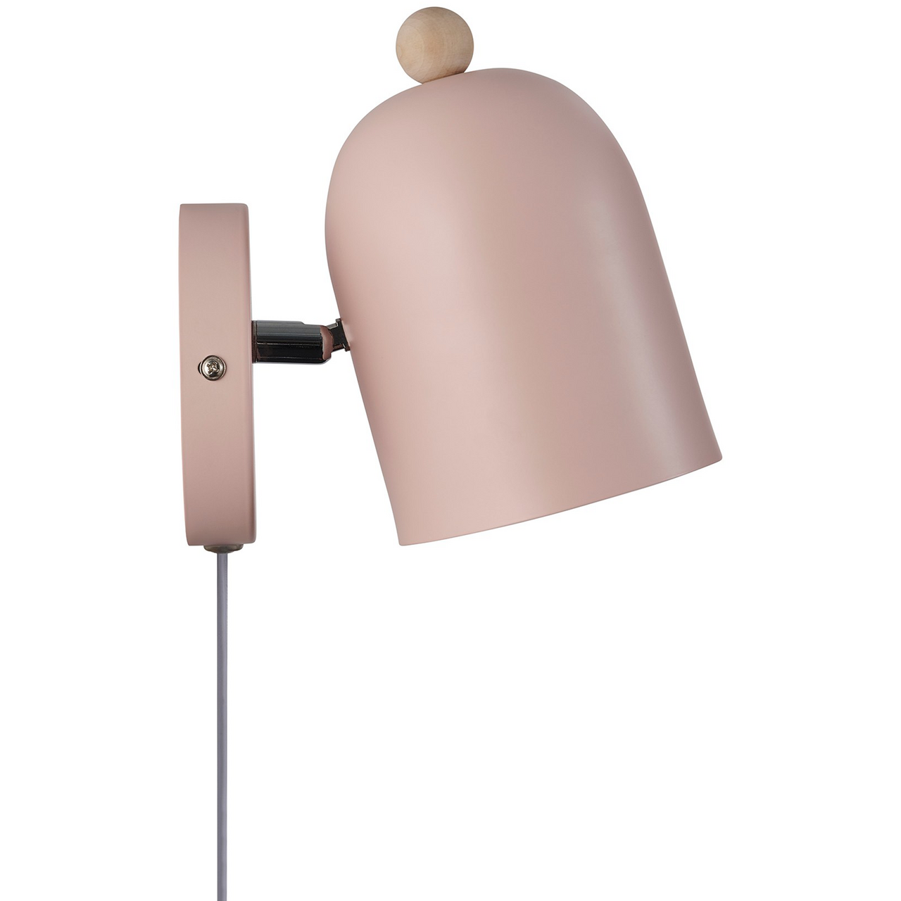 Vegglampen kombinerer en enkel, avrundet skjerm med en liten tredetalj på toppen for et mykt nordisk uttrykk. Den justerbare skjermen gjør det enkelt å rette lyset dit du trenger det, enten lampen brukes ved seng, skrivepult eller som ekstra veggbelysning.