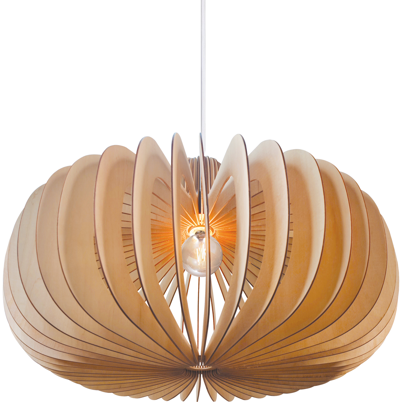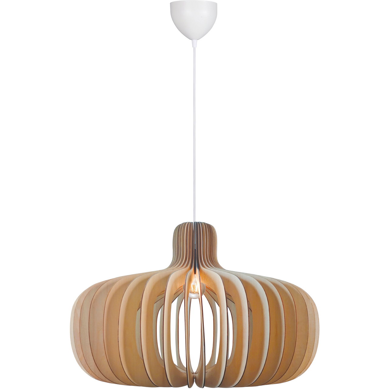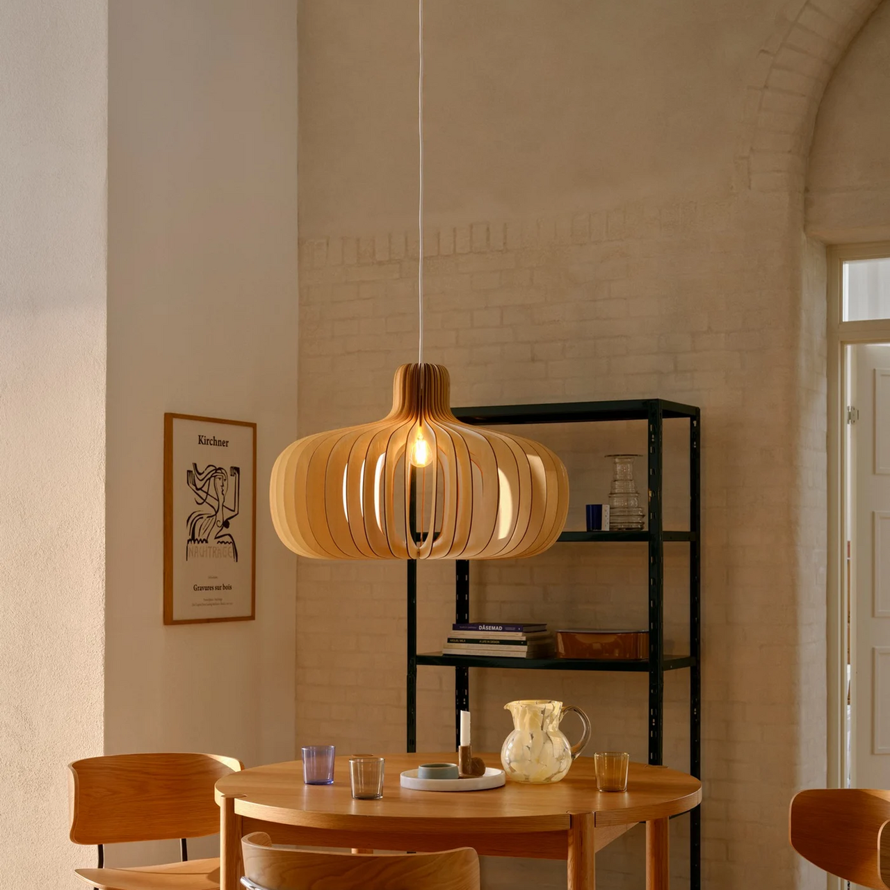 Taklampen er en åpen pendel der trestrukturen tilfører rommet et varmt, naturlig uttrykk. Den luftige formen slipper lyset vakkert ut i rommet og gjør lampen godt egnet over spisebord, i stue eller andre soner der du ønsker en dekorativ pendel med tydelig karakter. Lampen leveres som byggesett som er enkel å montere.
