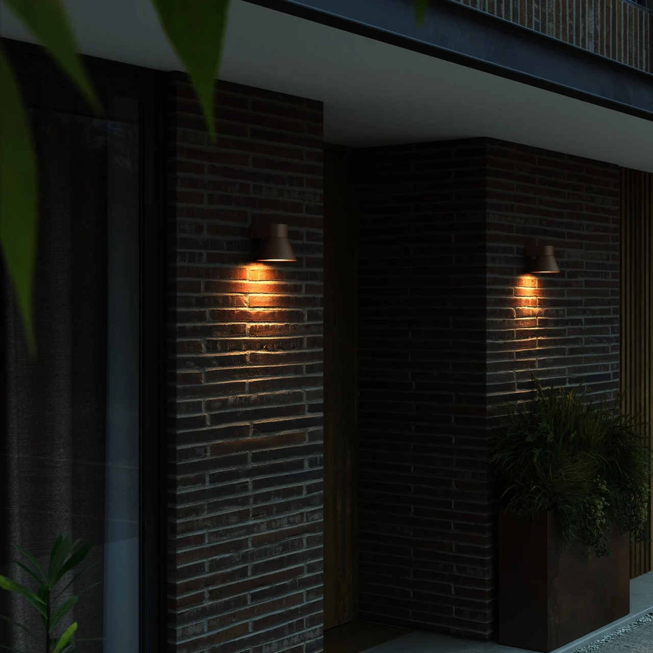 Kyklop Cone er en klassisk utendørs vegglampe med konisk skjerm og dekorativt nedoverrettet lys.