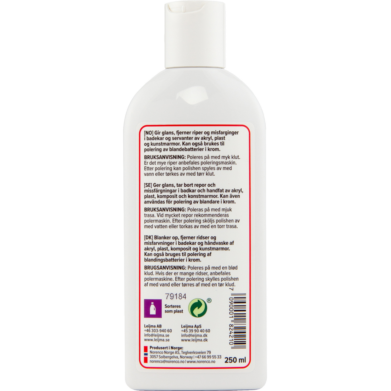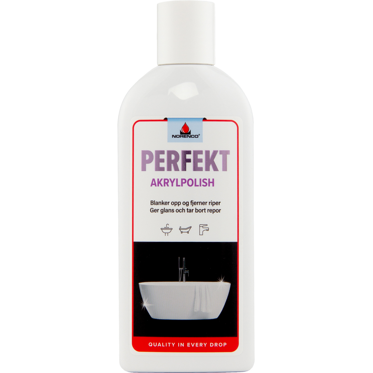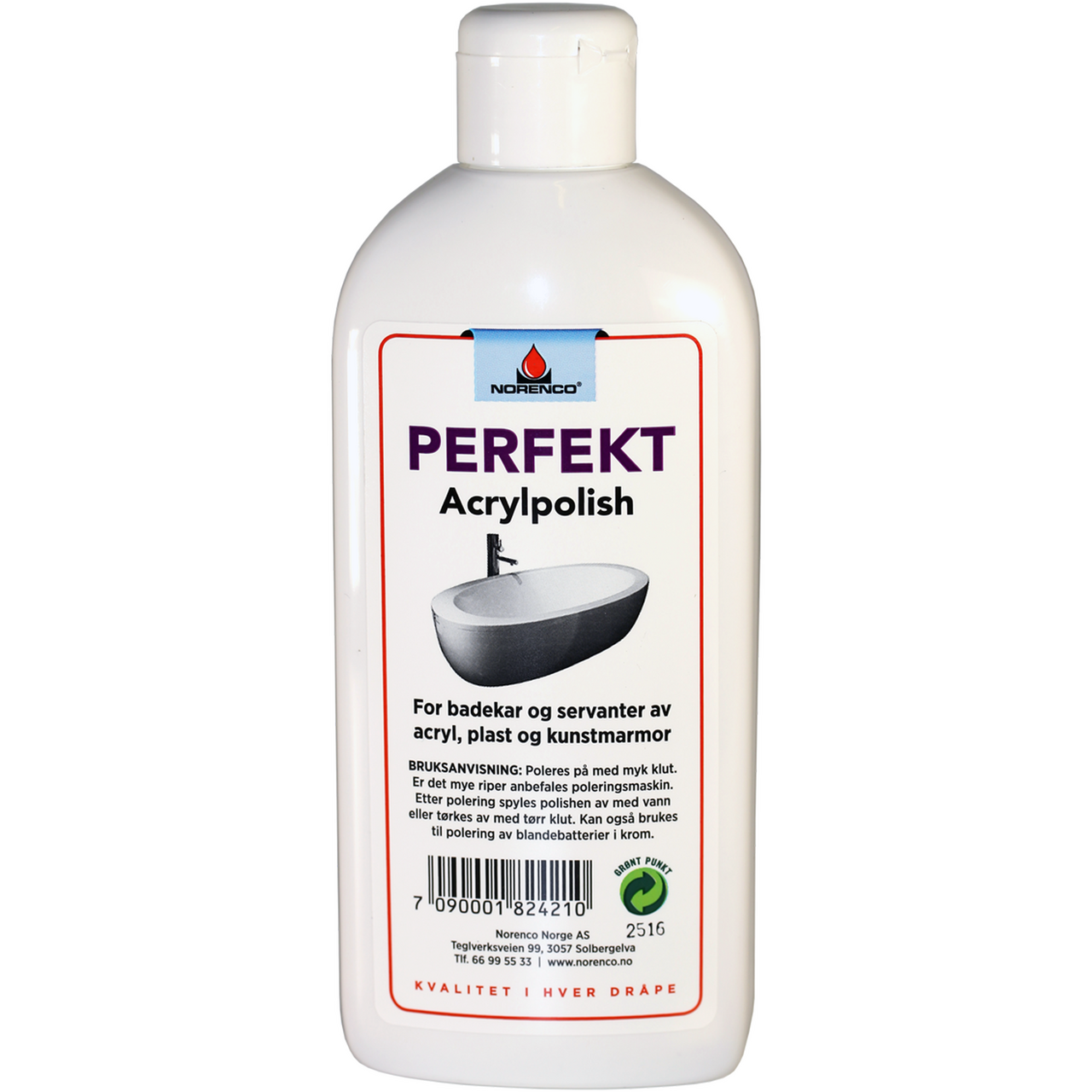 Polish for badekar og servanter av akryl, plast og kunstmarmor. Fjerner riper og blanker opp. Fjerner også misfarging/flekker, som blant annet hårfarge.