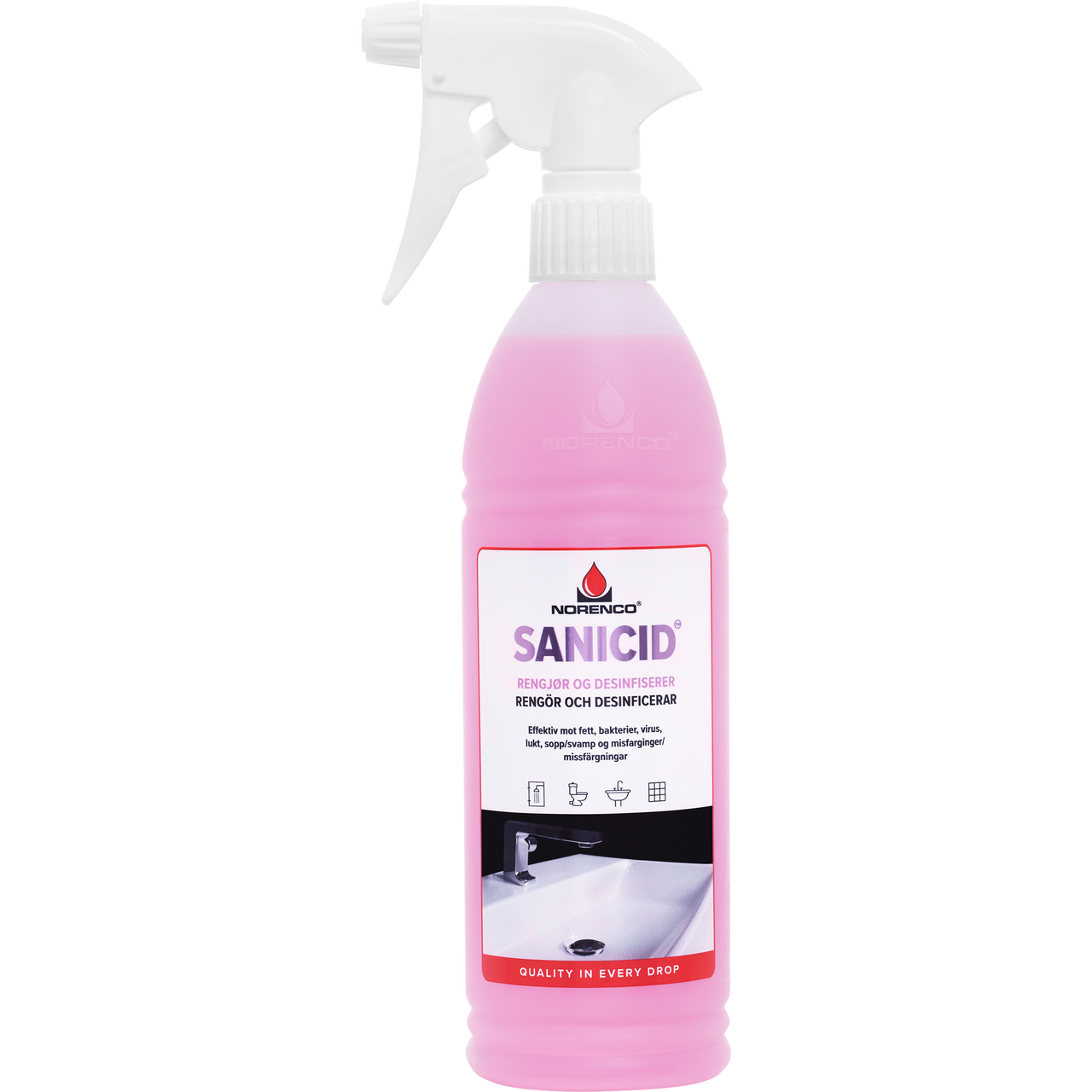 Norenco Sanicid er en effektiv rengjøringsspray for bad og våtrom.