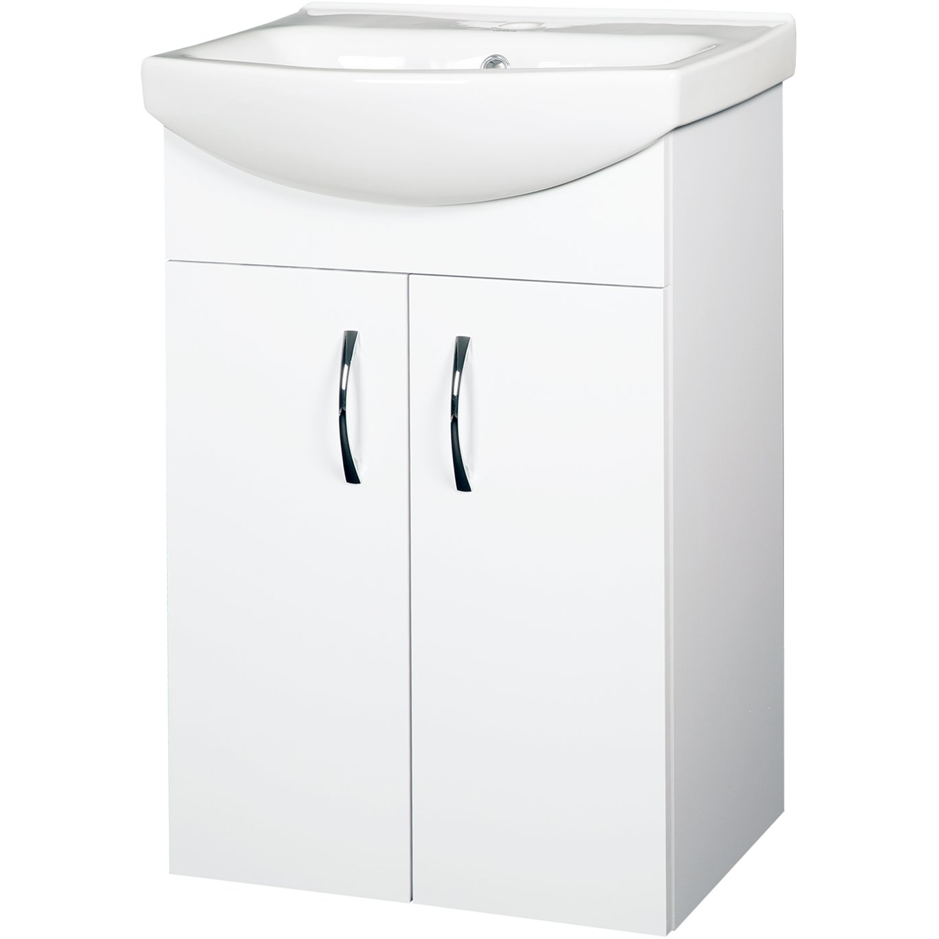 Nortiq Artic er et klassisk baderomsmøbel i 50cm bredde i hvit høyglans. Møbelet leveres med en buet servant i porselen, et underskap med to dører og to håndtak i forkrommet aluminium. Dette møbelet er perfekt til mindre bad eller til gjestetoalettet.