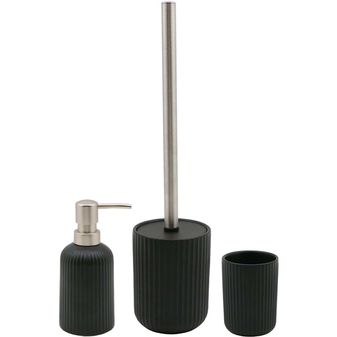 Dette baderomssettet fra Nortiq er med på å skape en helhet på baderommet, og består av en såpedispenser, et tannbørstekrus og et toalettbørstesett.