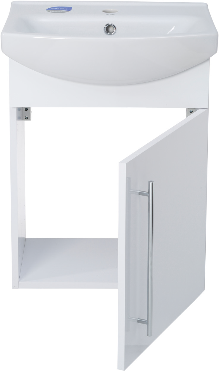 Baderomsmøbelet leveres med en buet servant i porselen, underskap med dør, og håndtak i forkrommet aluminium.