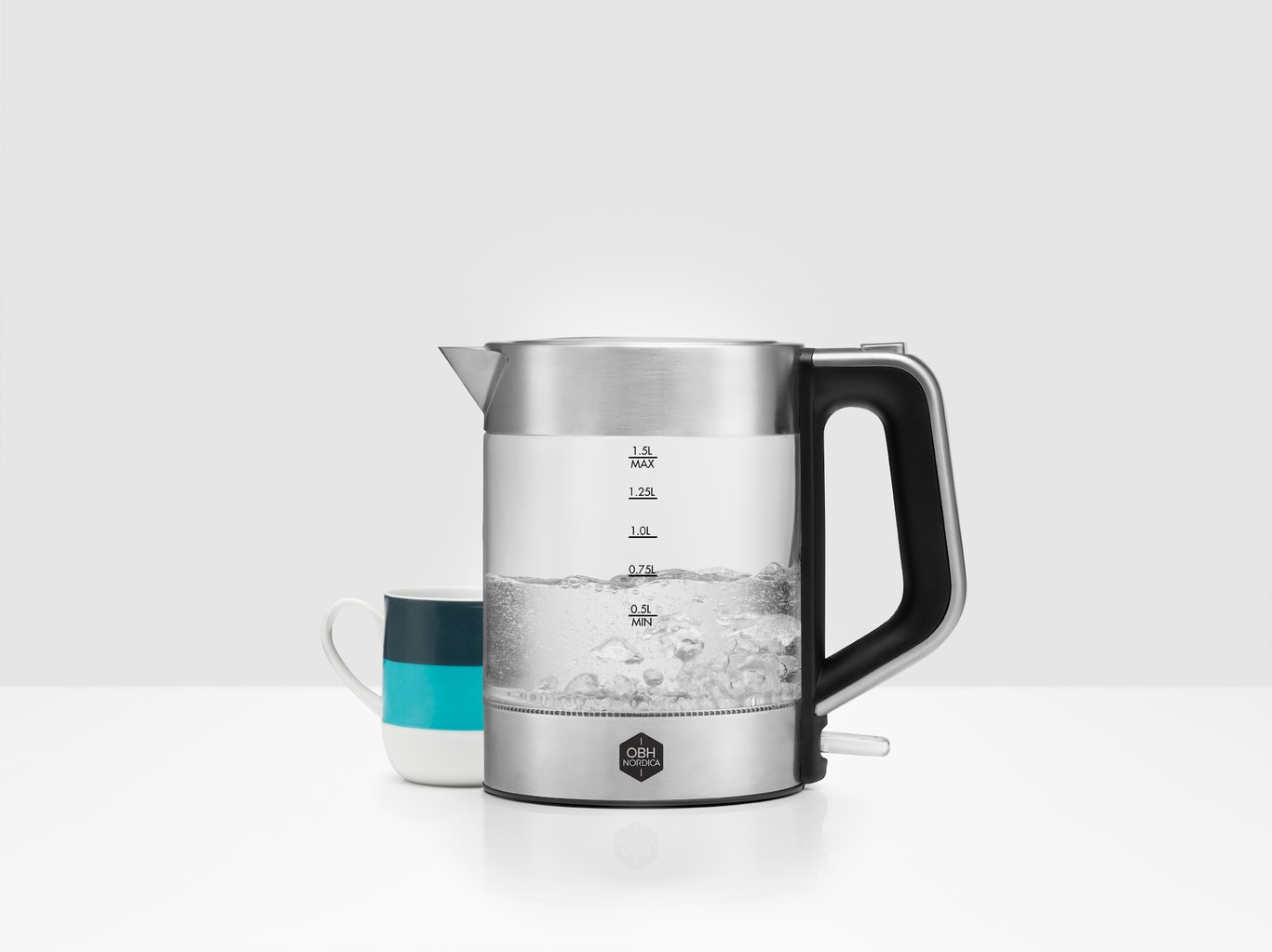 Denne vannkokeren fra OBH Nordica har et stilrent design, og en kapasitet på 1,5 liter. Den har et behagelig håndtak og en smart helletut.