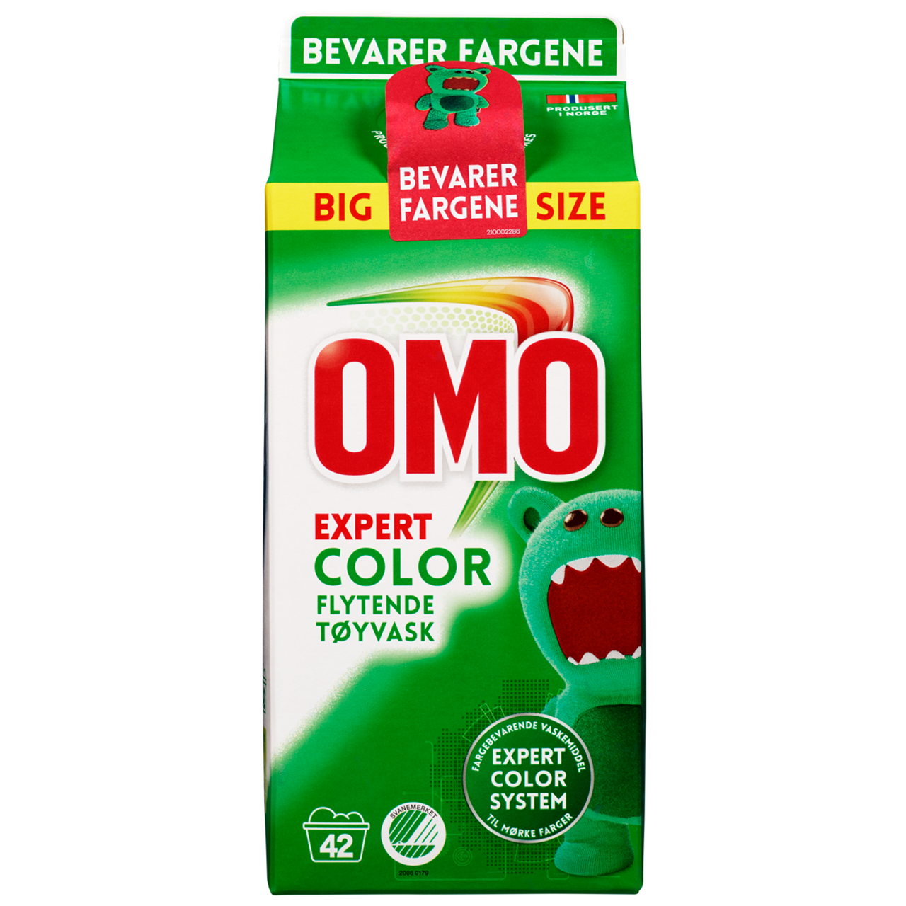 OMO Expert Color tøyvaskemiddel i stor kartong med en praktisk helletut.