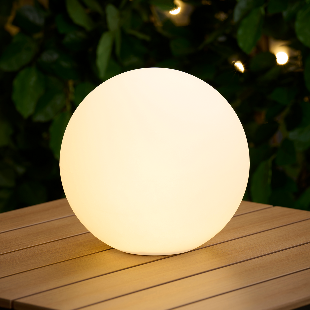 Dekorativ og stemningsskapende solcellelampe i rund utførelse, ideell for hage, terrasse eller balkong.