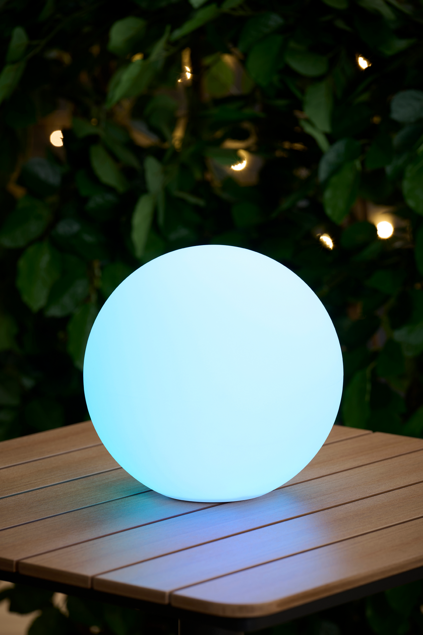 Lampen lades av solen på dagtid og gir et behagelig lys når mørket faller på. Du kan enkelt velge mellom varm hvit belysning eller stemningsfull RGB-farge via bryteren. En fleksibel og energivennlig løsning som ikke krever strømtilkobling.