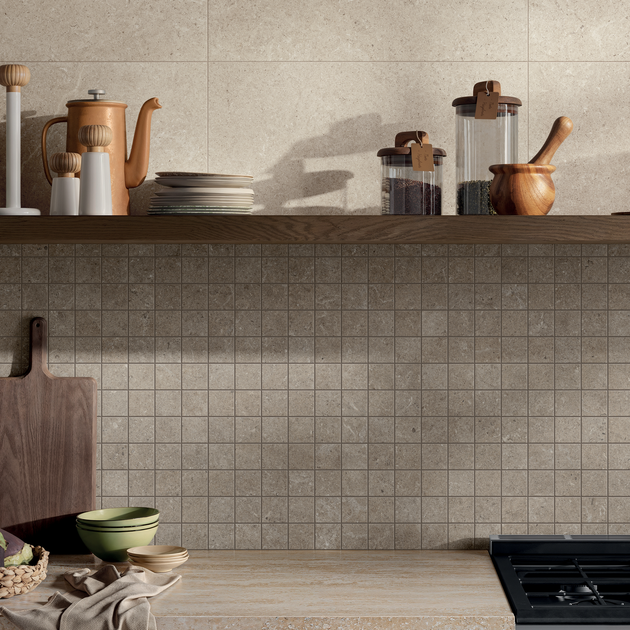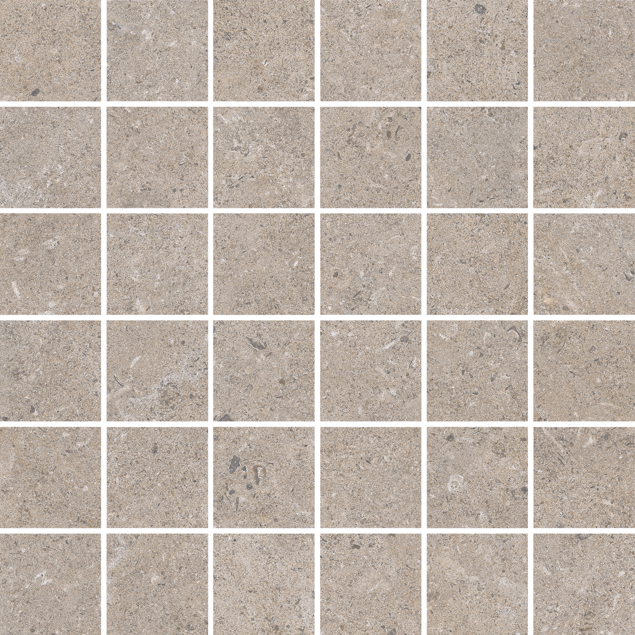Surround-serien fra italienske Panaria består av moderne og stilrene porcellanatofliser med en matt overflate. Denne mosaikken i størrelse 30 x 30 cm har en overflate i en mørk, nøytral beigefarge.