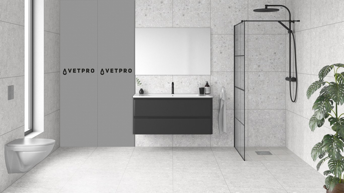 Våtromsplatene fra Vetpro er testet og godkjent av SINTEF for montering på vegg, og kommer i flere ulike tykkelser. Platene er diffusjonsåpne membranplater som skal forhindre at vann og fukt trekkes inn i eksisterende underlag.