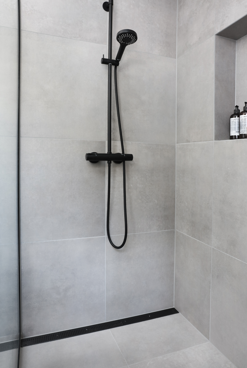 Med Purus Line lagt inntil veggen, blir det lett å opprette fall i kun én retning. Det gir en jevn, flat overflate der du ikke trenger å stå på sluket. I tillegg kan du legge de samme store flisene i dusjen som i resten av badet, noen som hever helhetsinntrykket og forenkler renholdet.