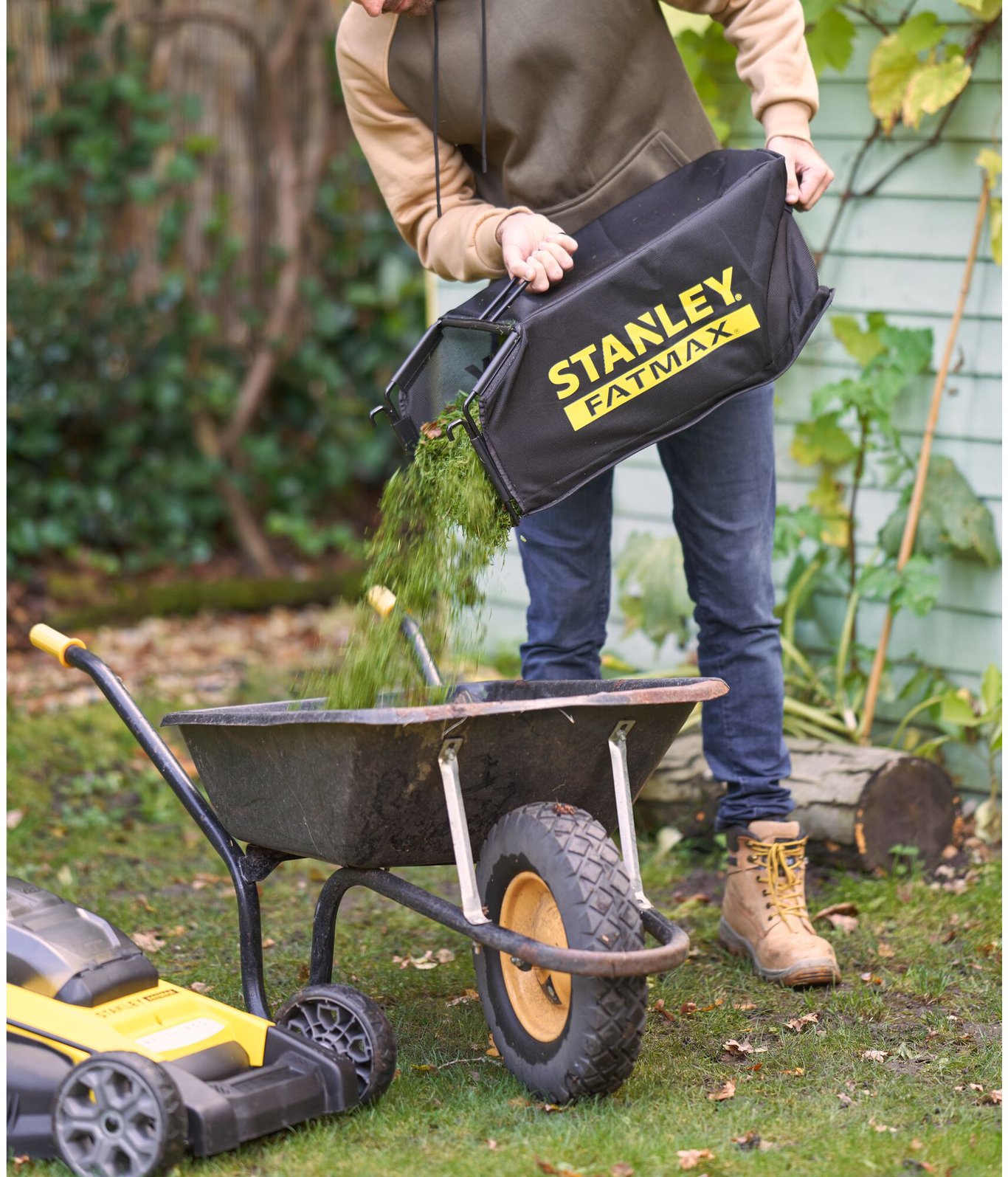 Denne gressklipperen fra Stanley Fatmax har et stort 49,5cm klippeblad for alle hager, samt en 40L kraftig oppsamlingspose av stoff.