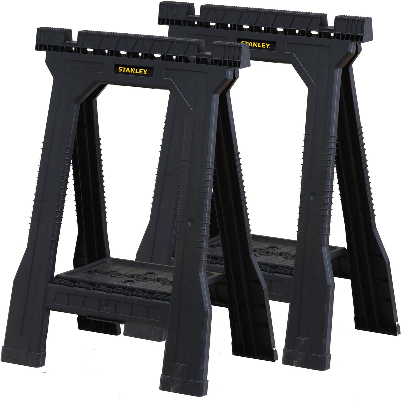 Disse sammenleggbare sagbukkene fra Stanley kommer med gummiben og antiskli-polstring. De har tilpassede spor som gir mulighet til å feste bjelker og plank på toppen, med en maksimal bredde på 40 mm. Bukkene kan også brukes som ben til arbeidsbord.