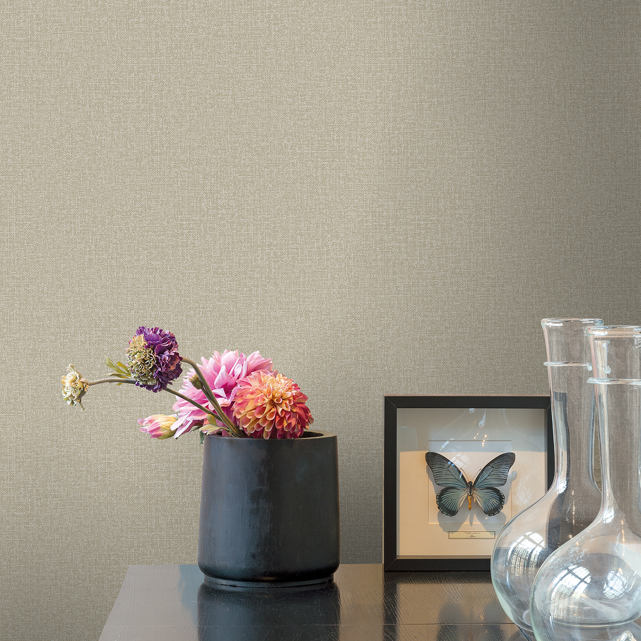 Denne tapeten fra Storeys er en elegant tapet med et lin-/tekstilinspirert uttrykk i grå/beigetoner med en varm undertone.