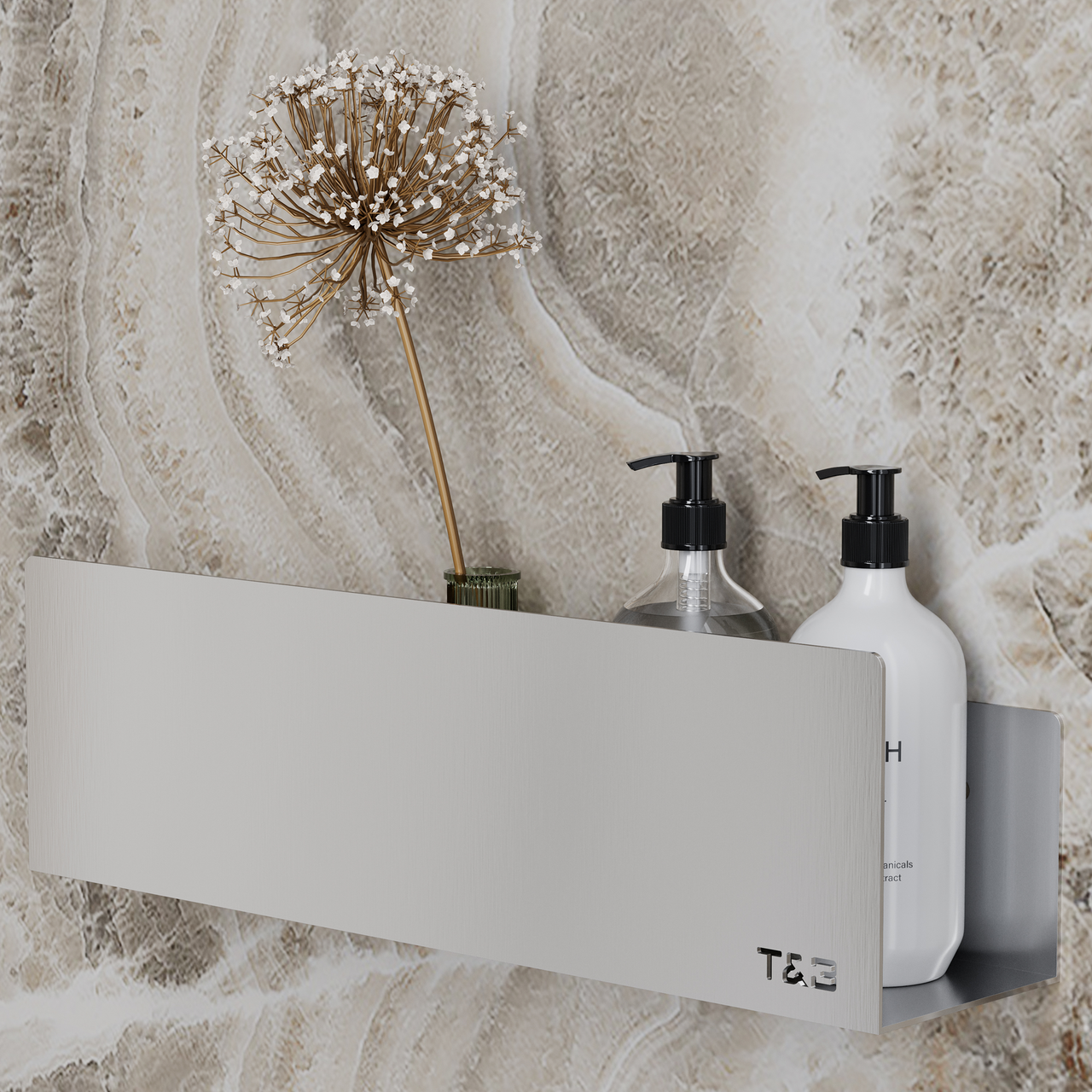 Med T&B hyllen får du to monteringsmuligheter: Bruk den medfølgende 3M-tapen for godt feste uten boring, eller velg tradisjonell skrumontering for ekstra stabilitet. Skruer kjøpes separat.