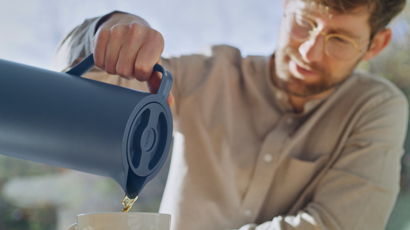 Denne termokannen fra Tefal har et minimalistisk design med rene linjer. Den kan holde drikken varm i opptil 12 timer, eller kald i 24 timer.