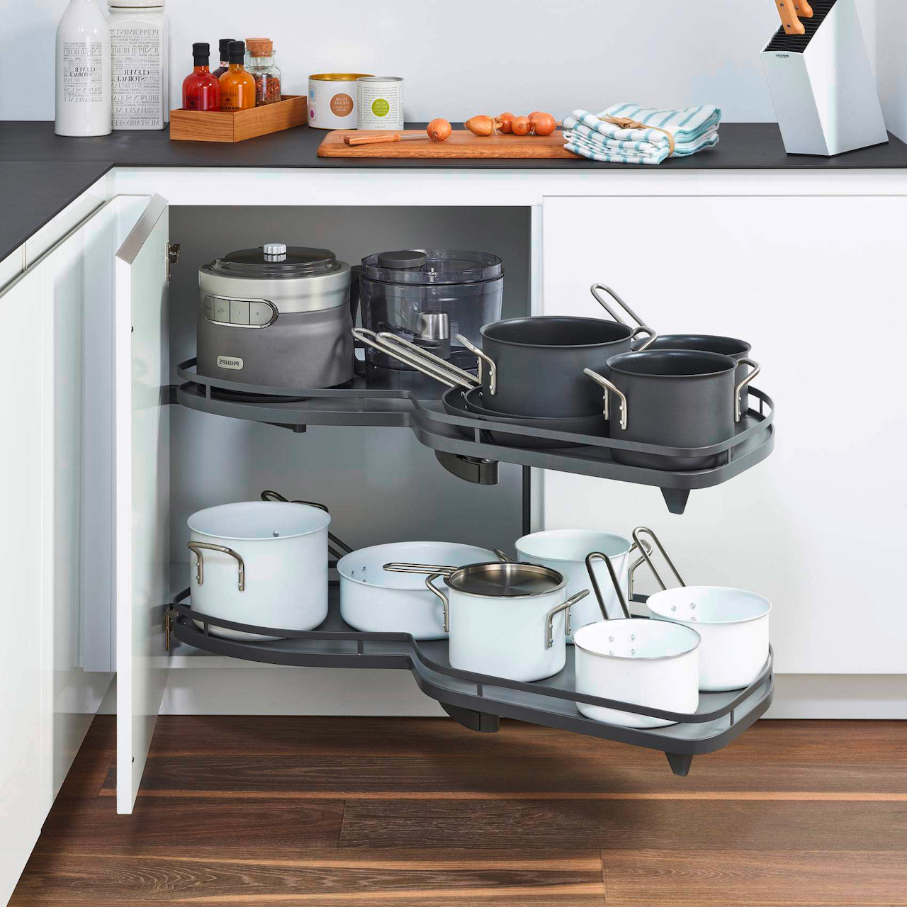 Dette uttrekket for hjørneskap fra Kesseböhmer kombinerer elegant design og funksjonalitet. Uttrekket optimaliserer lagringsplassen i skapet, og denne modellen har fester på høyre side.