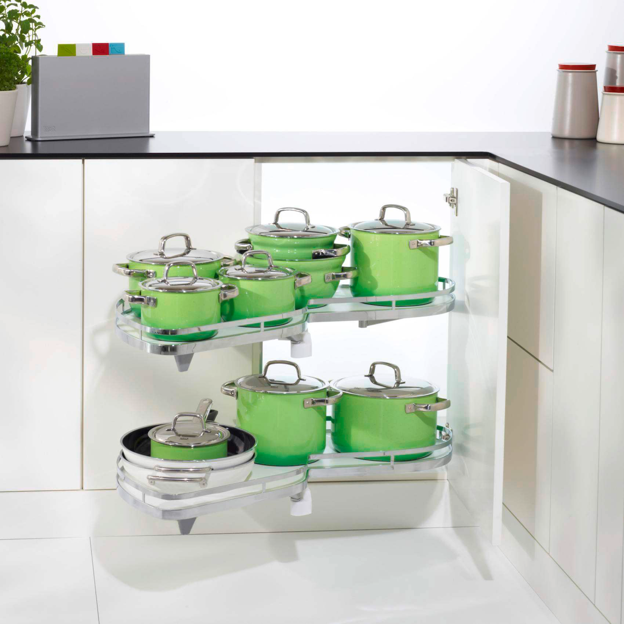 Dette uttrekket for hjørneskap fra Kesseböhmer kombinerer elegant design og funksjonalitet. Uttrekket optimaliserer lagringsplassen i skapet, og denne modellen har fester på venstre side.