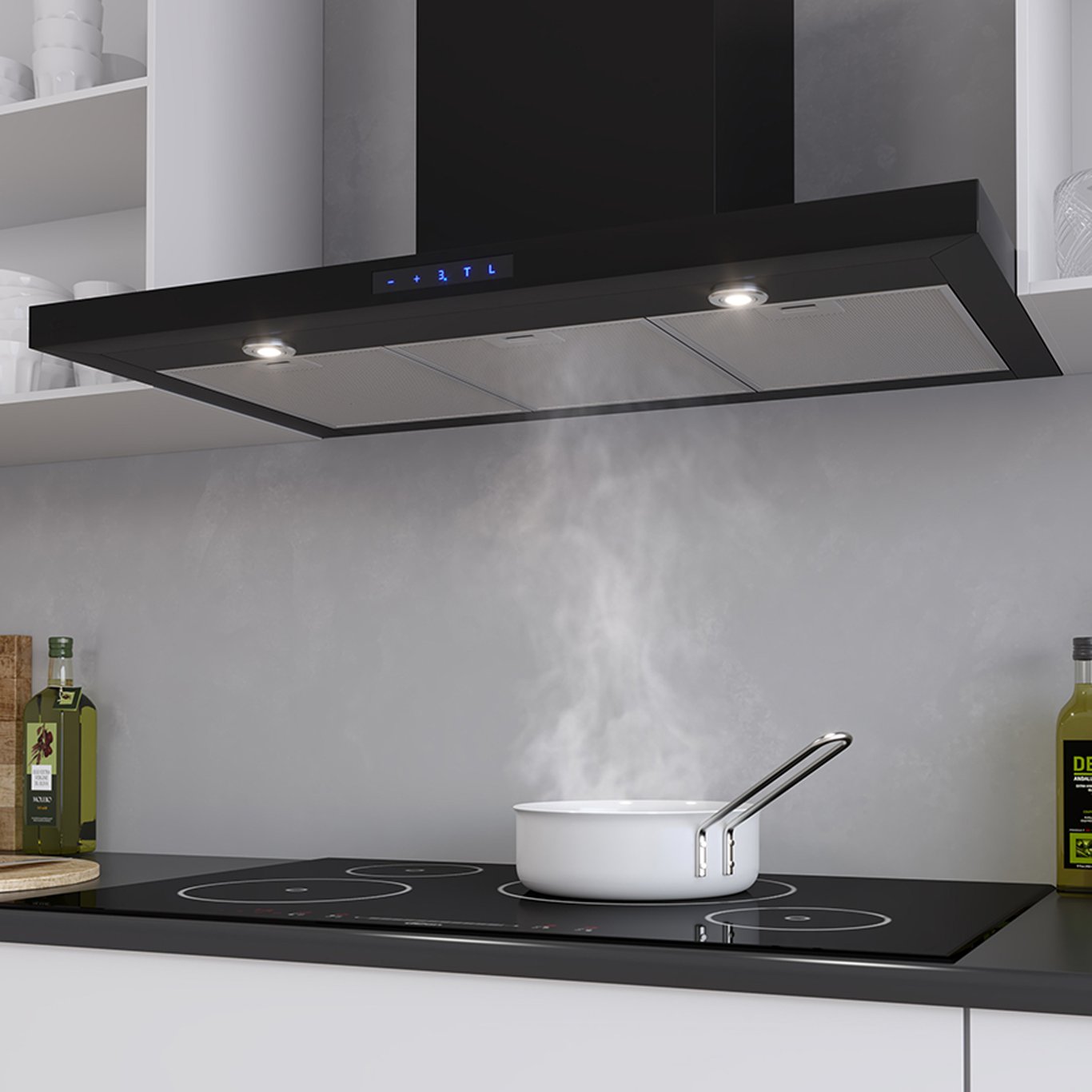 Kjøkkenhetten er 90 cm bred, og har en intern motor. Den kommer med to stykk LED-lys, som gir et godt arbeidslys over kokeplaten.