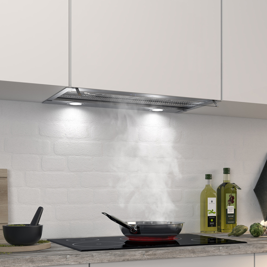 Kjøkkenhetten er 60 cm bred, og har en innebygd motor. Den kommer med to stykk LED-lys, som gir et godt arbeidslys over kokeplaten.