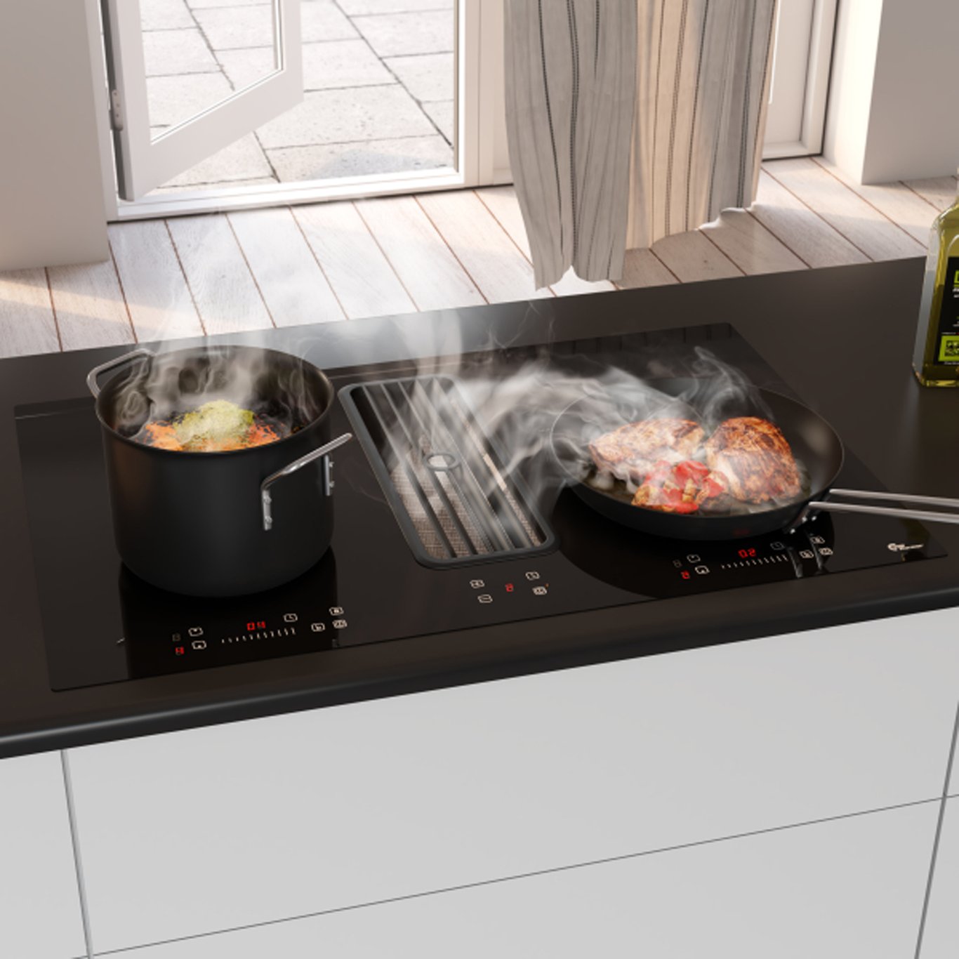De fire kokesonene har 9-trinns varmeregulering og boost-funksjon. Den er brukervennlig og sikker å bruke, med både restvarmeindikator, timer og barnesikring. Den integrerte viften er effektiv og stillegående, og har tre hastigheter å velge mellom.