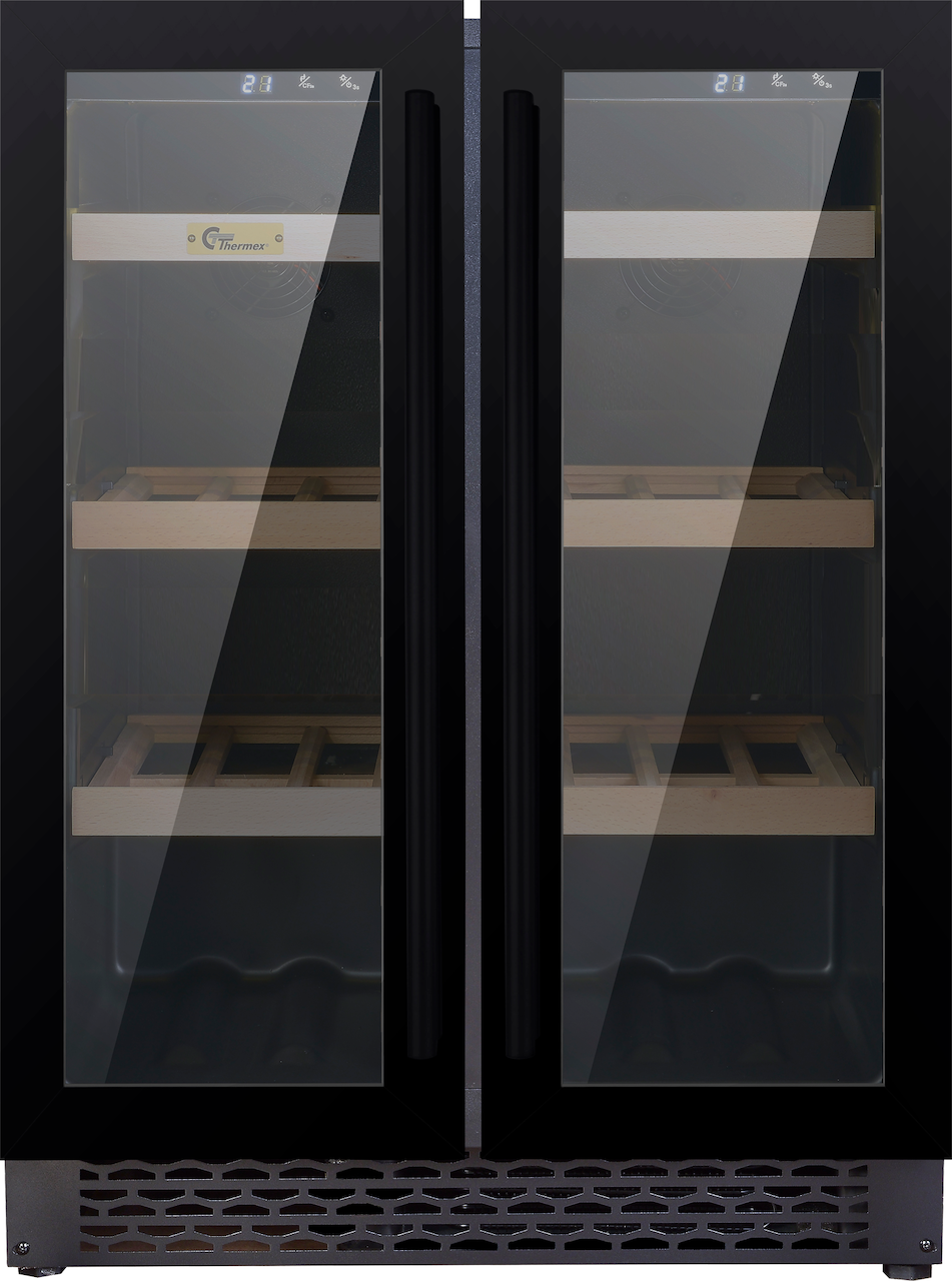 Thermex 40 er et dobbelt skap med en sone på hver side. Det er LED-lys i toppen og sidene av skapet. Skapet kommer med en stillegående, vibrasjonsdempet kompressor, og en ventilasjonsrist i sokkelen, som sikrer ventilasjon selv om skapet bygges inn.