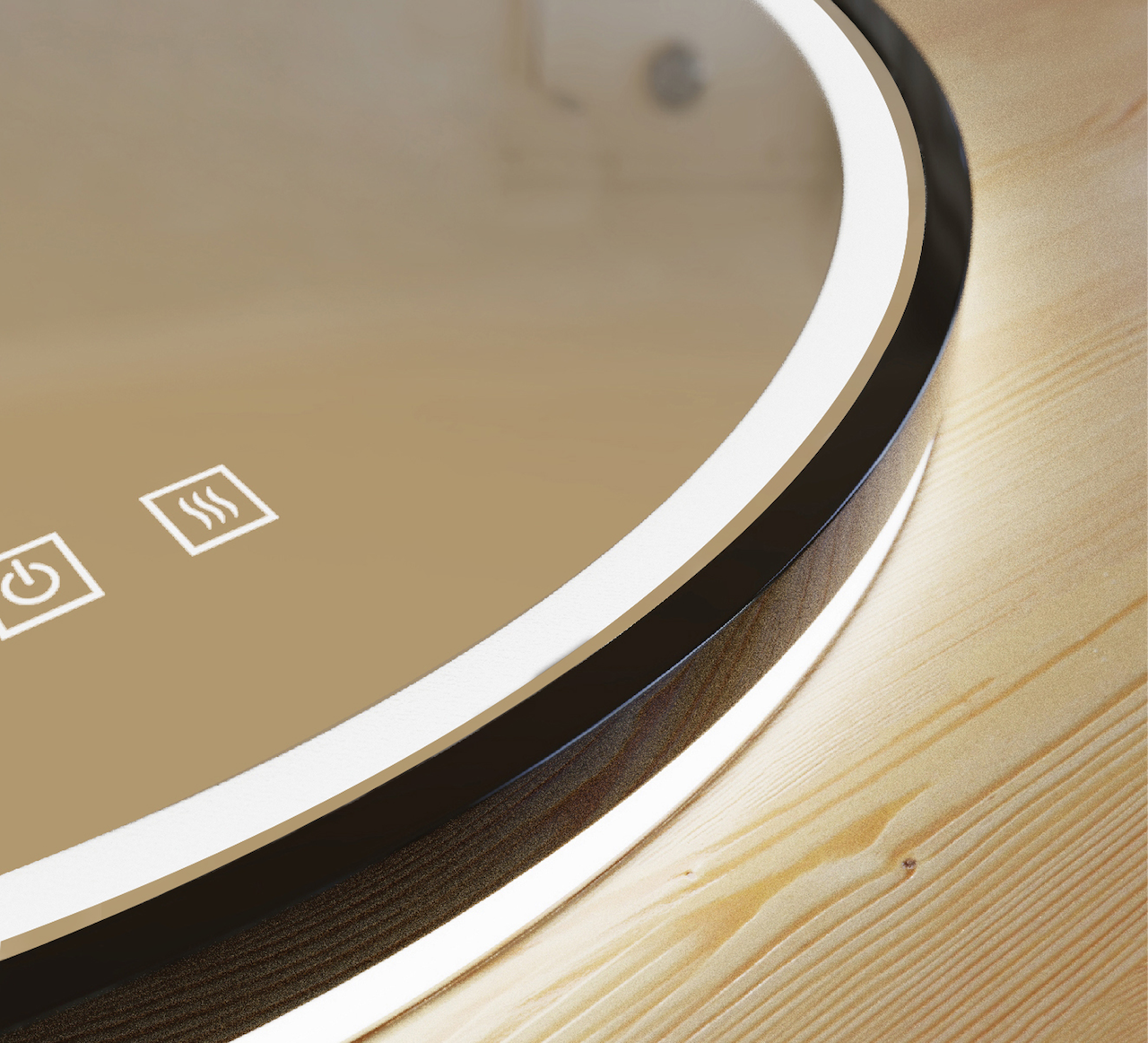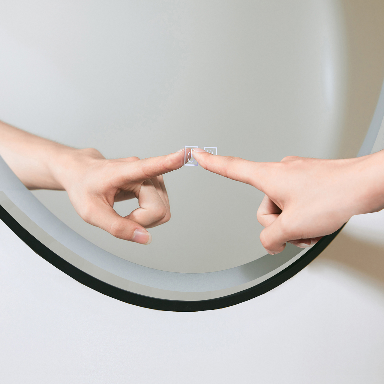 Foran på speilet er det to touchknapper, hvor den ene brukes til å skru på/av, justering av fargetemperatur og dimming. Den andre touchknappen brukes for å sku på/av anti-dugg-funksjonen. Anti-dugg-funksjonen vil også skru seg av automatisk etter 30 minutter. Minnefunksjonen vil huske siste innstilling på speilet.