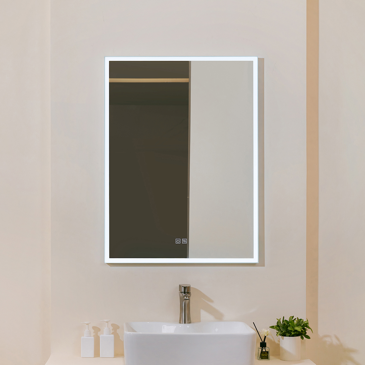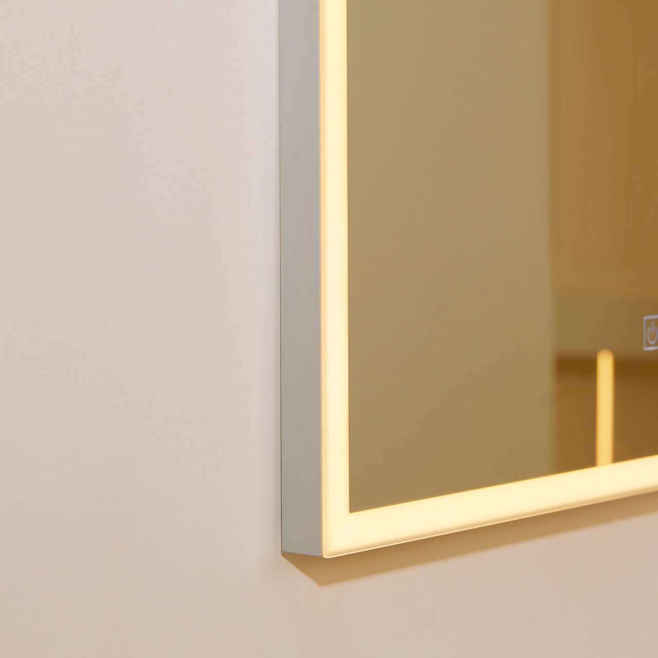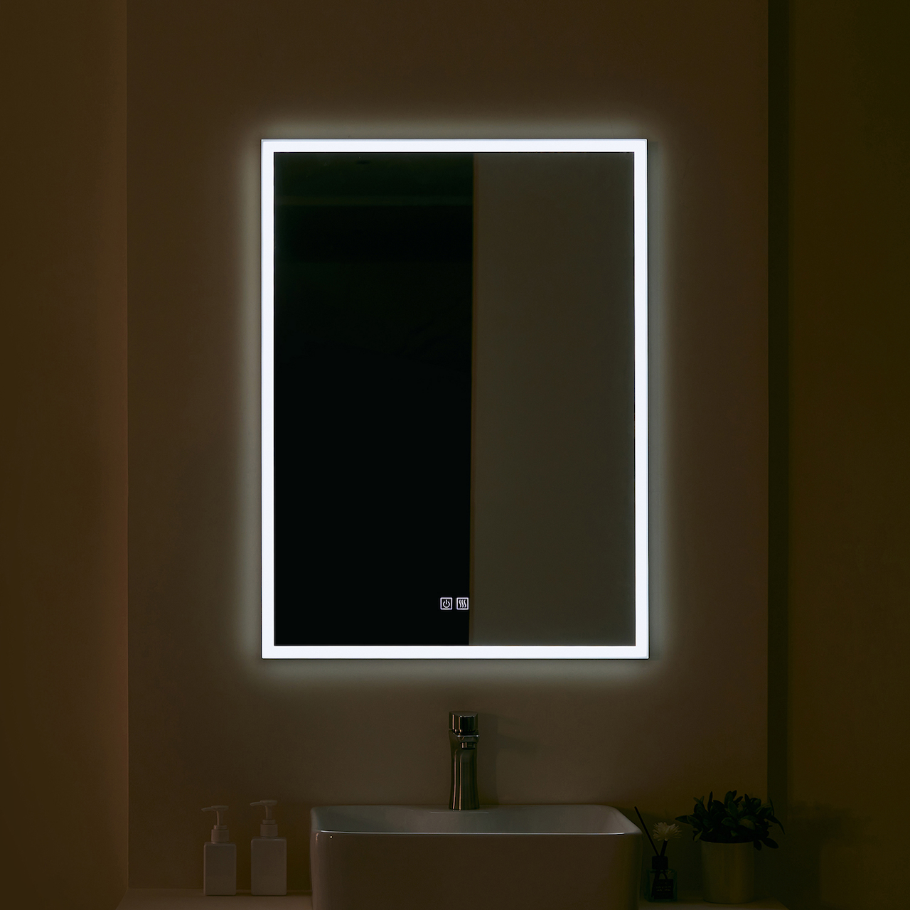 Foran på speilet er det to touchknapper, hvor den ene brukes til å skru på/av, justering av fargetemperatur og dimming. Den andre touchknappen brukes for å sku på/av anti-dugg-funksjonen. Anti-dugg-funksjonen vil også skru seg av automatisk etter 30 minutter. Minnefunksjonen vil huske siste innstilling på speilet.