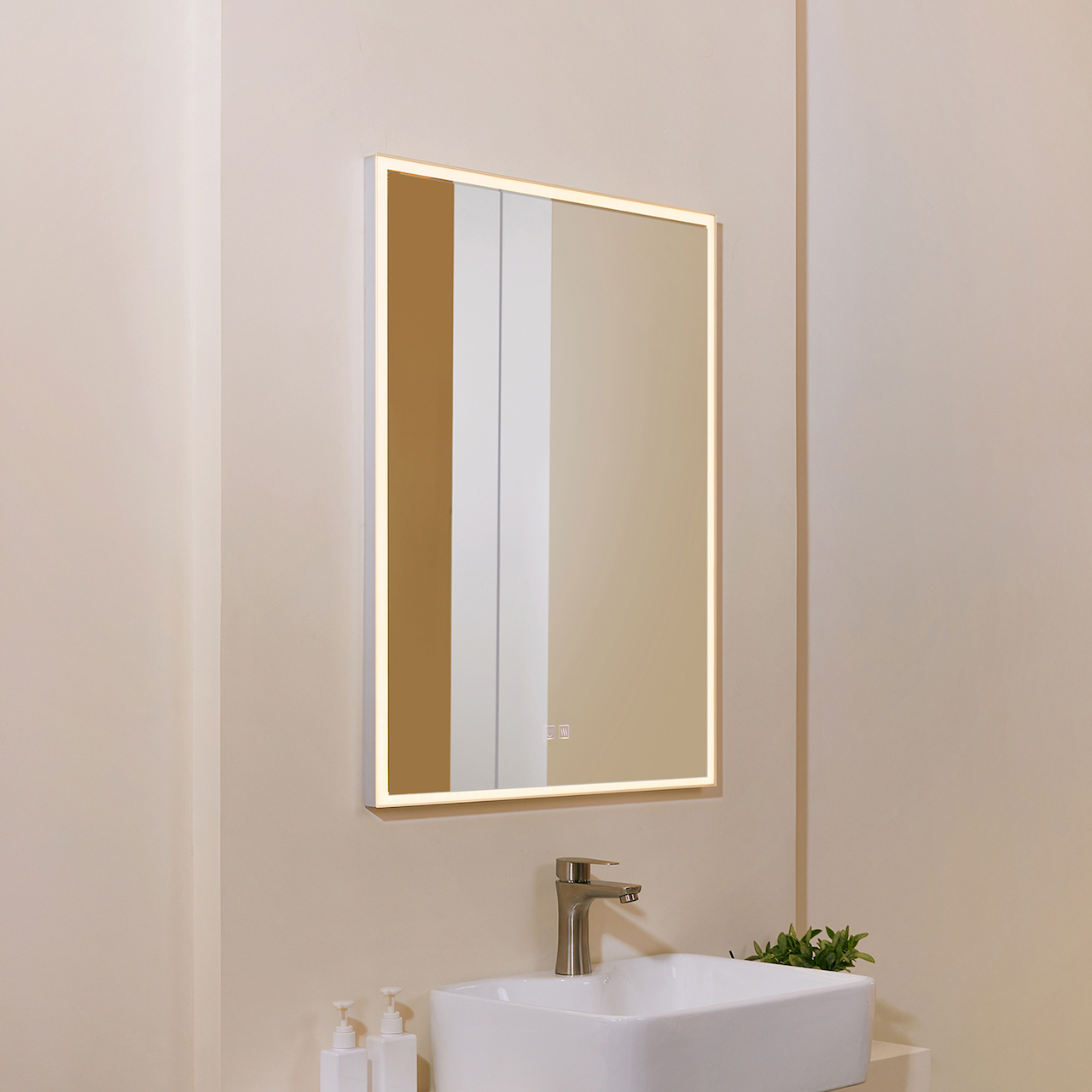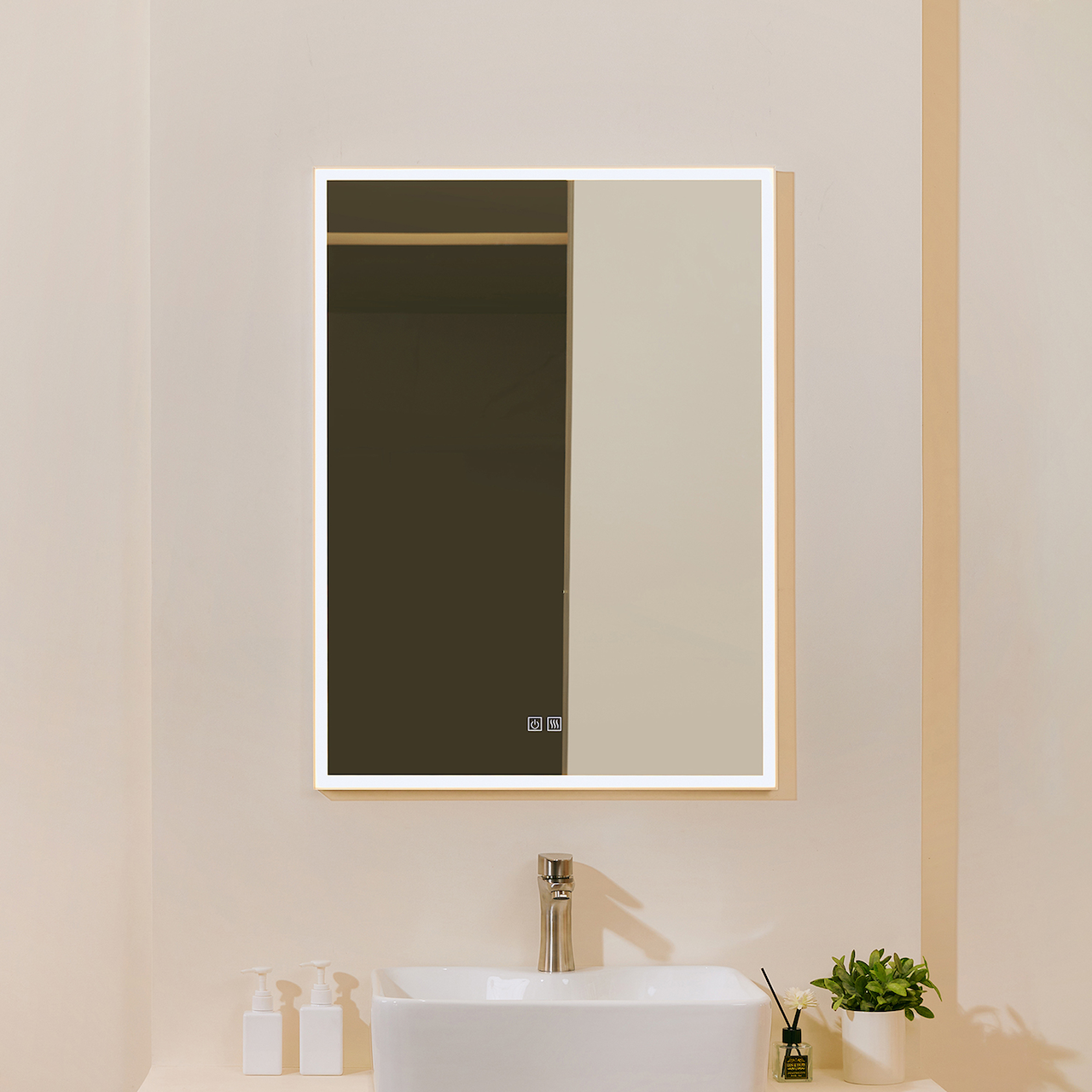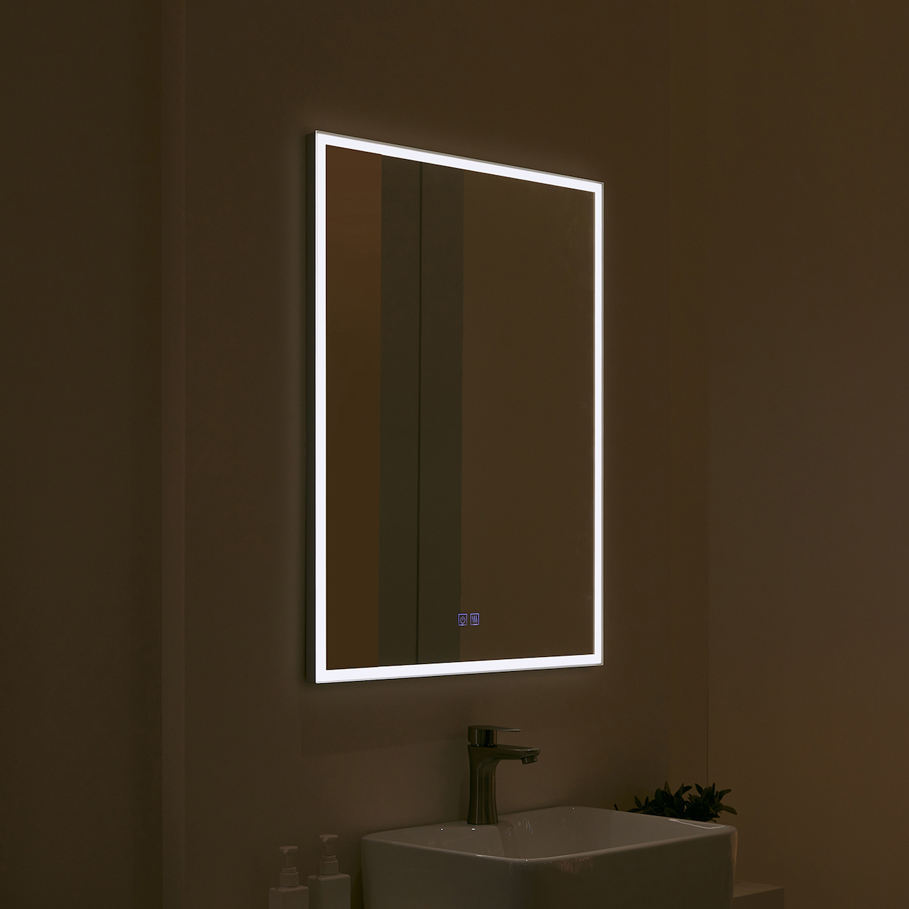 Foran på speilet er det to touchknapper, hvor den ene brukes til å skru på/av, justering av fargetemperatur og dimming. Den andre touchknappen brukes for å sku på/av anti-dugg-funksjonen. Anti-dugg-funksjonen vil også skru seg av automatisk etter 30 minutter. Minnefunksjonen vil huske siste innstilling på speilet.