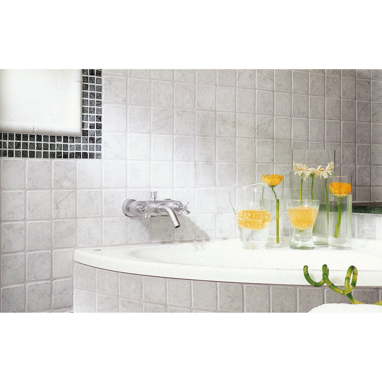 Bianco Carrara er antikk marmor i 10x10 fra Italia. Flisen har en noe ujevn halvmatt overflate med et marmorert fargespill av gråtoner med innslag av beige, på en lys grå flate.