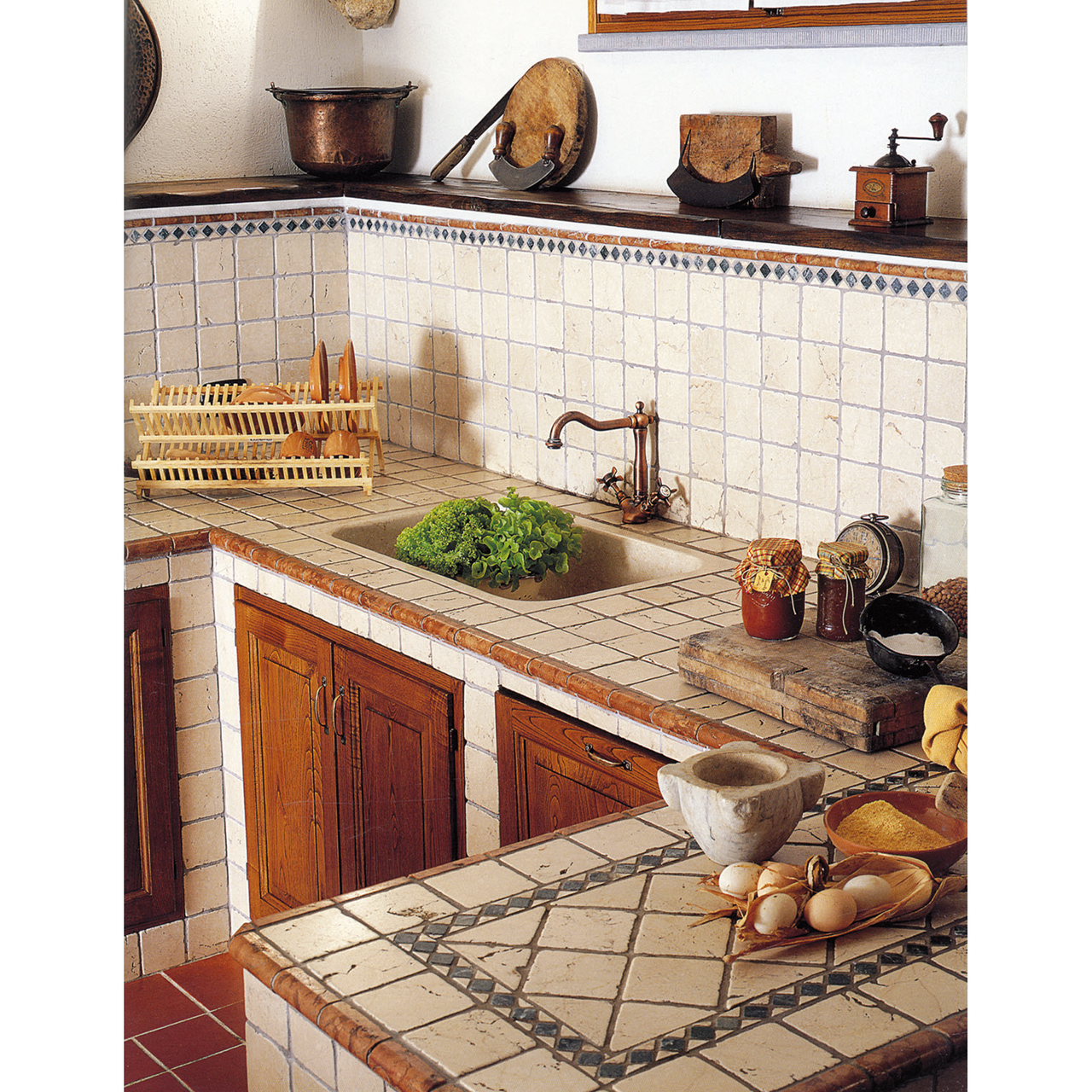 Flisen har et tradisjonelt format med mål på 10x10. Overflaten er slett med noen ujevnheter, halvmatt med et marmorert fargespill av beigetoner på en offwhite flate. Kantene er noe ujevne og det vil kunne forekomme variasjoner i flisene. Helheten vil gi en varm og lun atmosfære, og gi et rustikt inntrykk