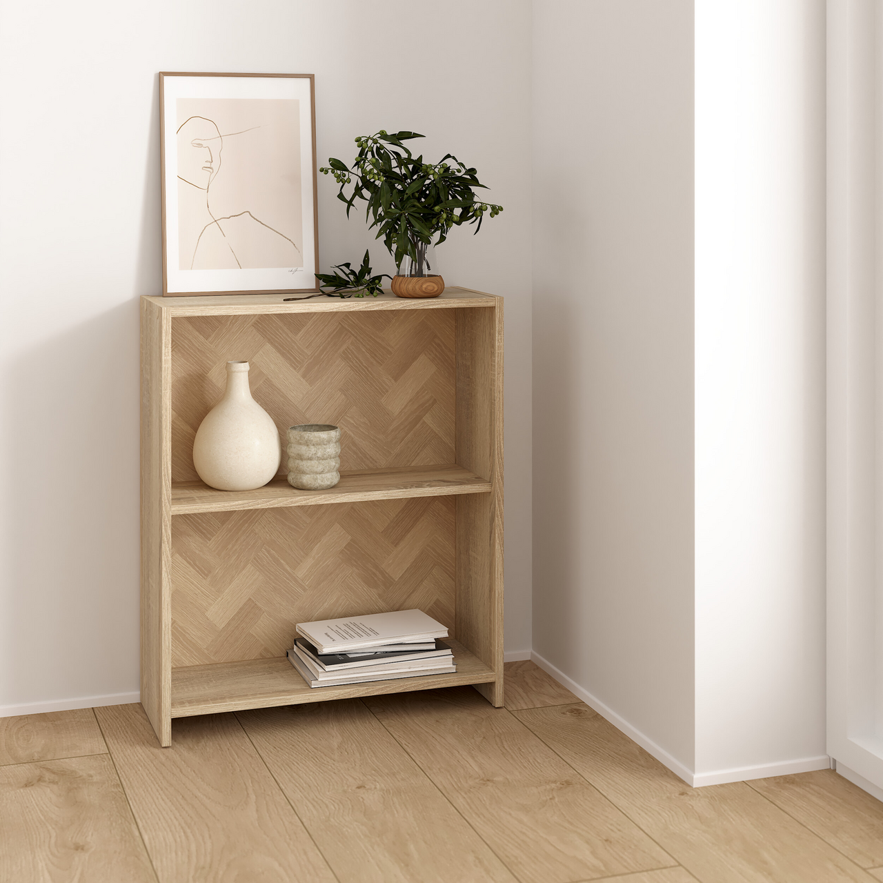 Denne bokhyllen passer godt til mindre rom, og gir god plass til bøker, pynt og småting. Den har et stilrent design i lyst treverk, med moderne fiskebensmønster på bakveggen.