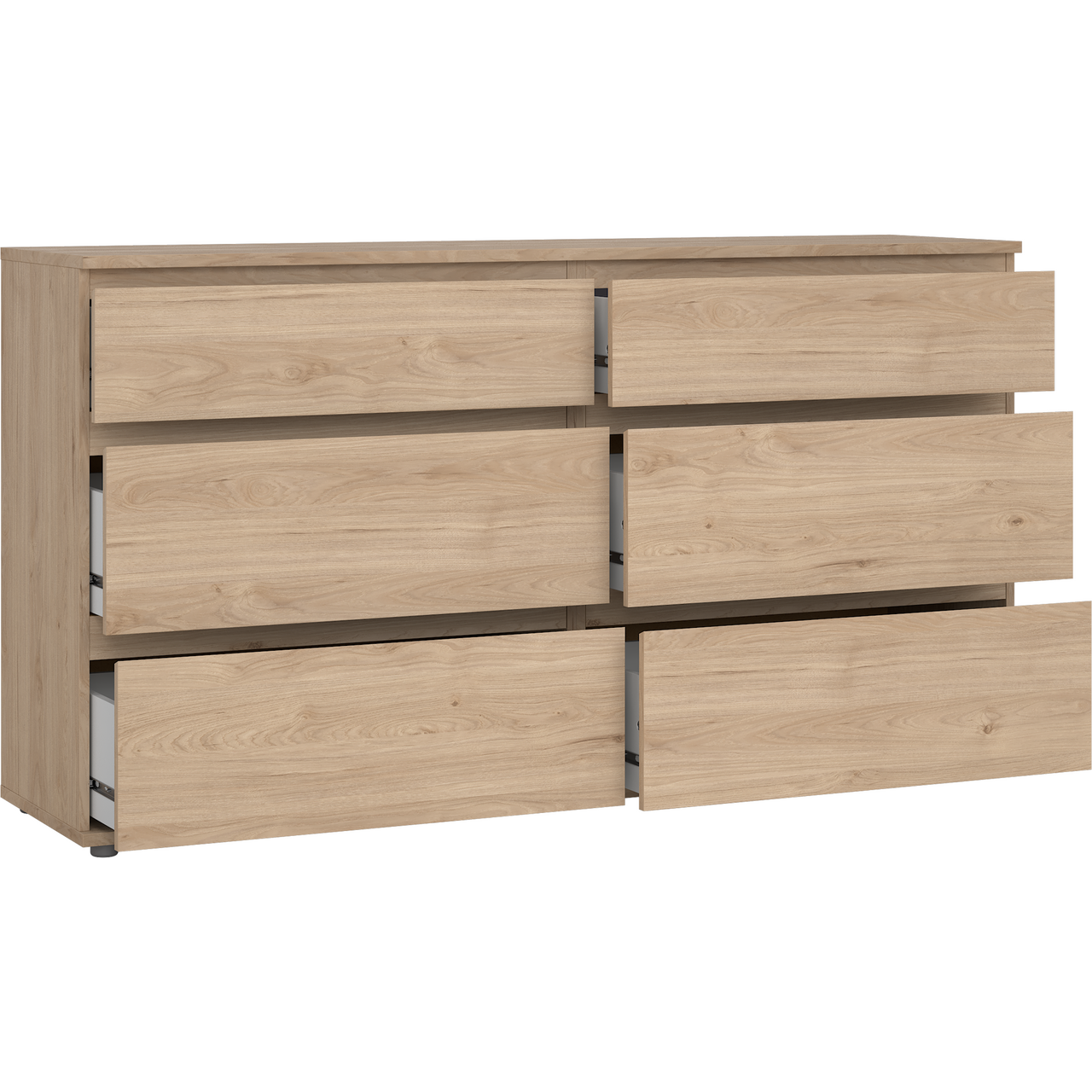 Med 6 romslige skuffer får du god plass til oppbevaring av klær, tekstiler eller andre ting du ønsker å holde organisert. Skuffene er utstyrt med glideskinner i stål med kulelager, som sikrer en jevn og enkel åpning og lukking.