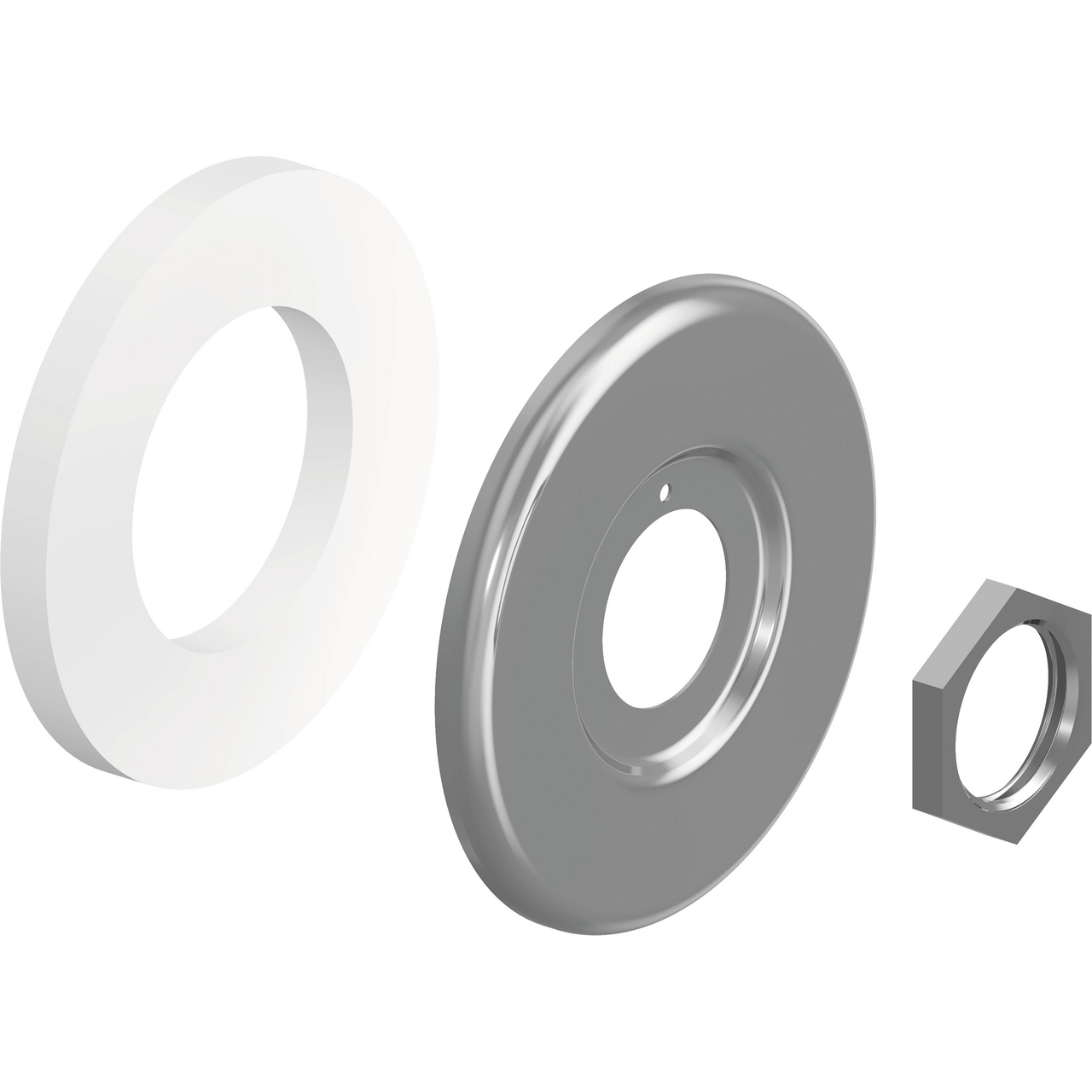 Dekorrosett med låsemutter for 1/2" tilkobling, krom utførelse. Gir en pen og tett avslutning rundt rørgjennomføring ved synlige tappevannsinstallasjoner, for eksempel ved veggbokser eller synlige armaturpunkt.