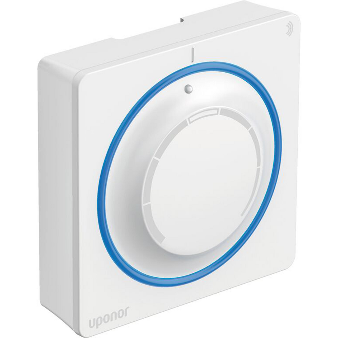 Uponor Smatrix Wave termostat med lysindikasjon bak dreieskiven som viser status etter endring av settpunktet, og gir visuell tilbakemelding for oppvarming eller kjøling.
