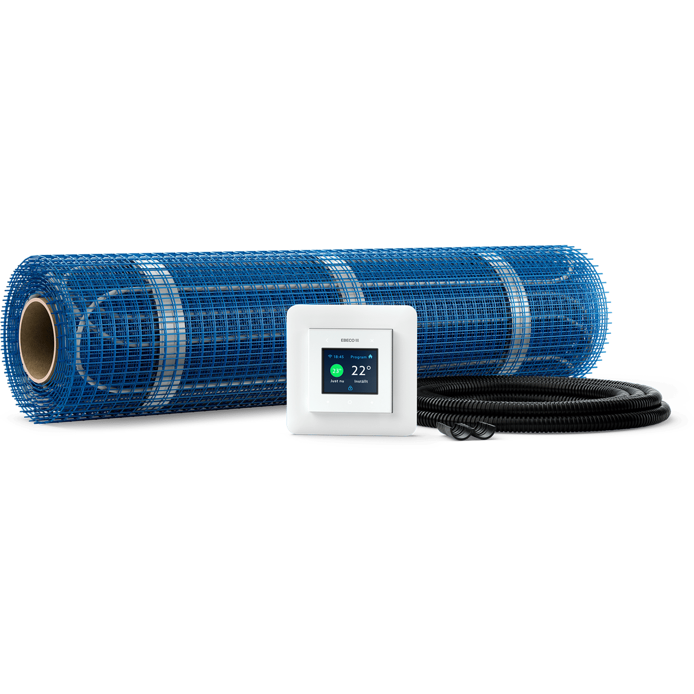 Thermoflex Kit 500 er gulvvarmekabel på selvklebende matte som er lett å rulle ut. Den WiFi-klargjorte termostaten EB-Therm 500 inngår i settet. Hvis du kjøper til tilbehøret EB-Connect WiFi, kan du styre gulvvarmen via appen Ebeco Connect eller via åpent API.