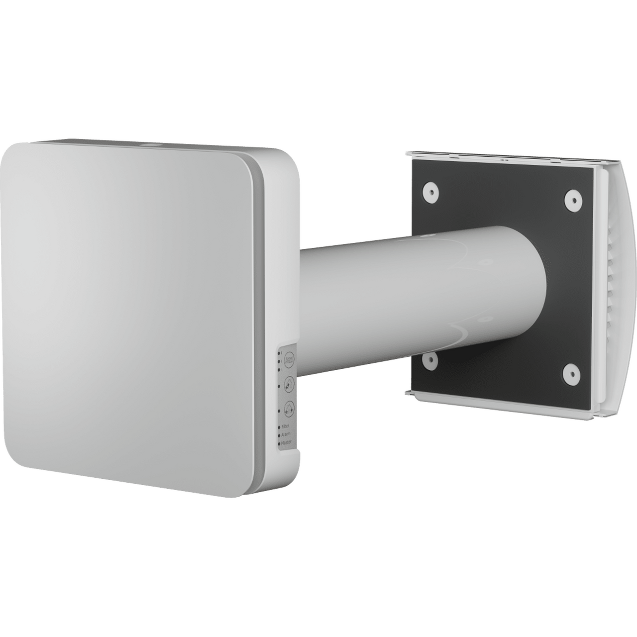 Denne romventilatoren fra Flexit gir ventilasjon med varmegjenvinning i deler av boligen eller i enkeltrom. Varmen gjenvinnes fra avtrekksluften i en keramisk varmegjenvinner som samtidig gir temperert og filtrert tilluft.