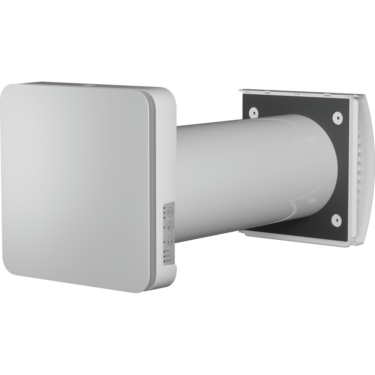 Denne romventilatoren fra Flexit gir ventilasjon med varmegjenvinning i deler av boligjen eller i enkeltrom. Varmen gjenvinnes fra avtrekksluften i en keramisk varmegjenvinner som samtidig gir temperert og filtrert tilluft.