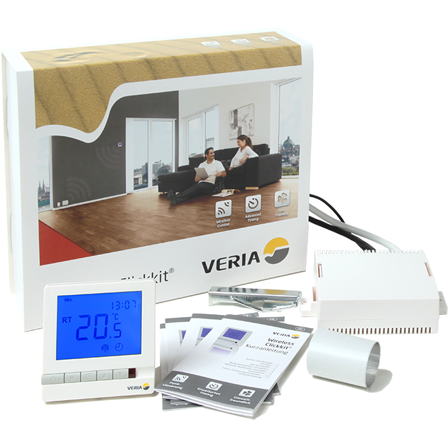 Sammen med din Veria Clickmat gulvvarme benytter du Veria Wireless Clickkit. Der følger det med en timer-termostat som kan styre gulvvarmesystemet trådløst og med mulighet for natt- og dagsenking.