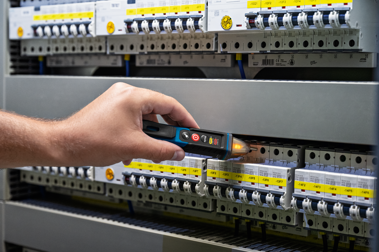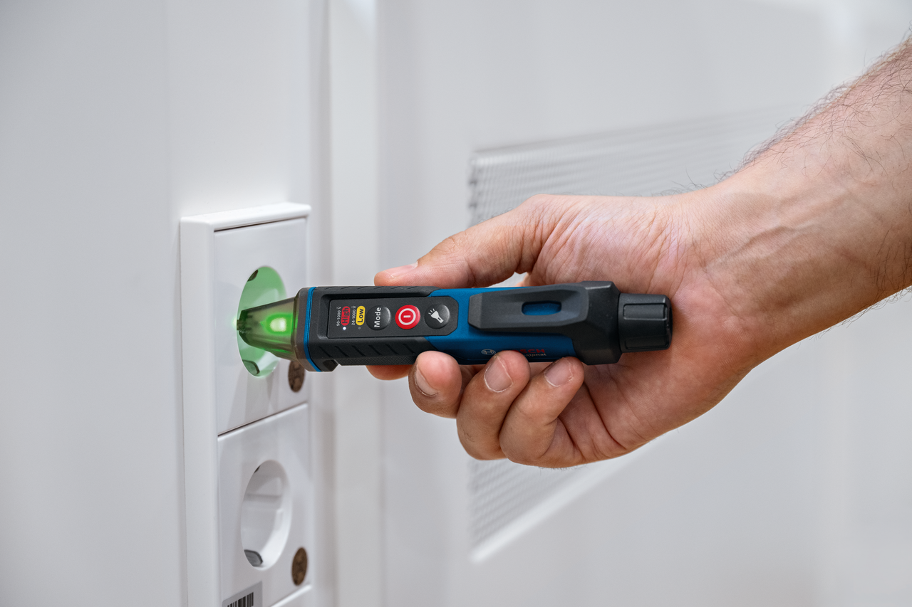 Denne spenningsdetektoren fra Bosch gjør det enkelt og sikkert å kontrollere om en leder er spenningssatt uten direkte kontakt.