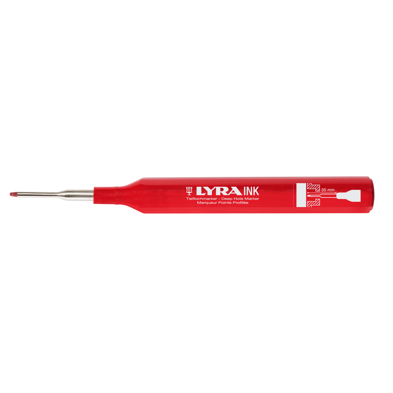 Merkepenn for oppmerking i smale og dype hull. For permanent merking på alle tørre materialer.